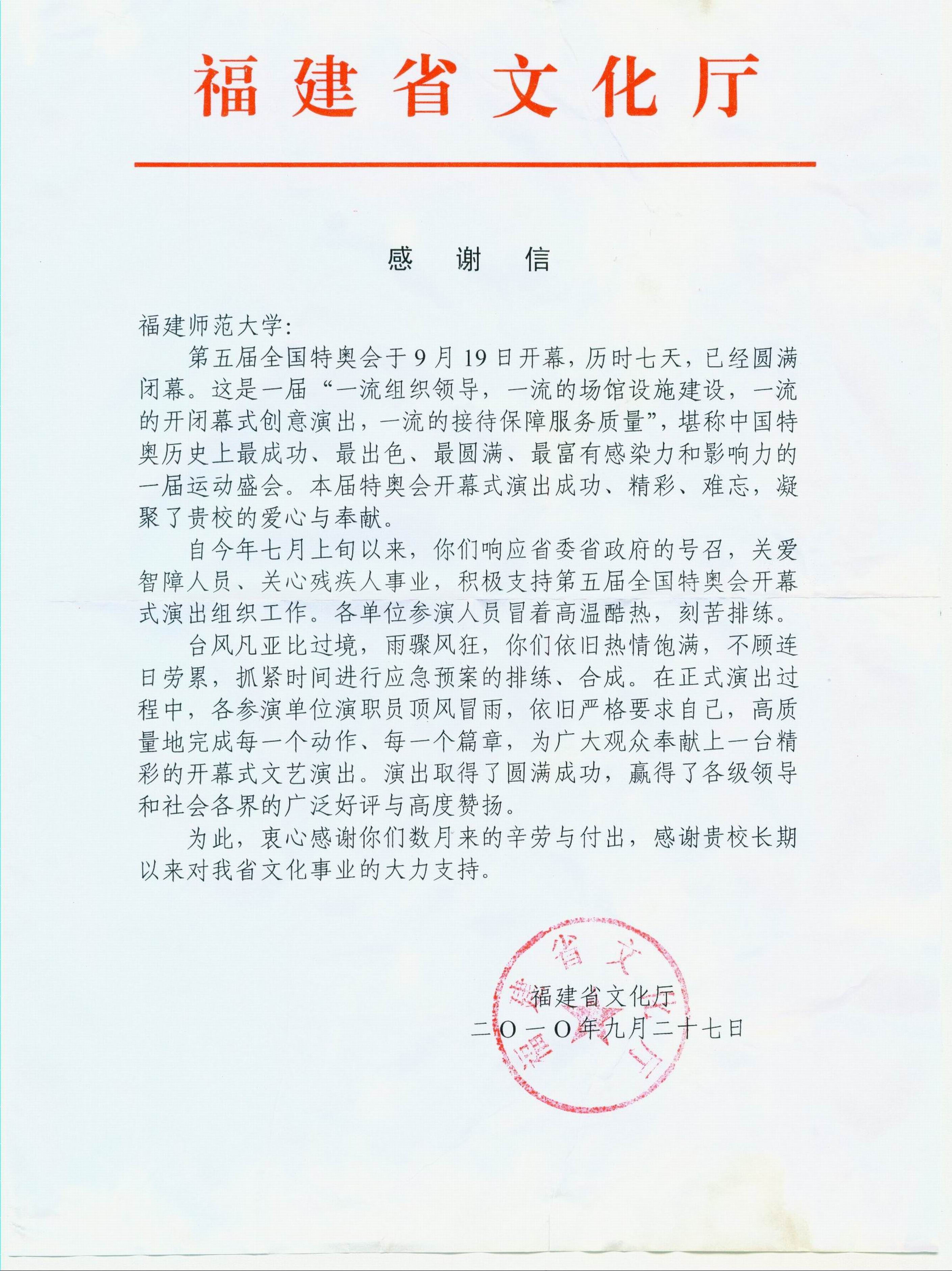 福建省文化厅致彩神xl(中国)有限公司感谢信