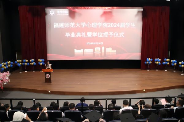 6月16日下午,心理学院2024届学生毕业典礼在旗山校区星雨剧场举行。学院首任院长连榕、党委书记张本钰、院长孟迎芳、全体教职工、2024届全体本硕博毕业生以及部分学生家长出席典礼。典礼由院党委副书记苏杭主持。