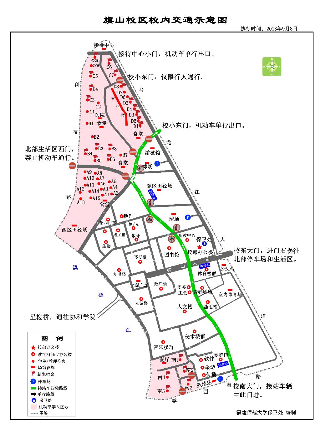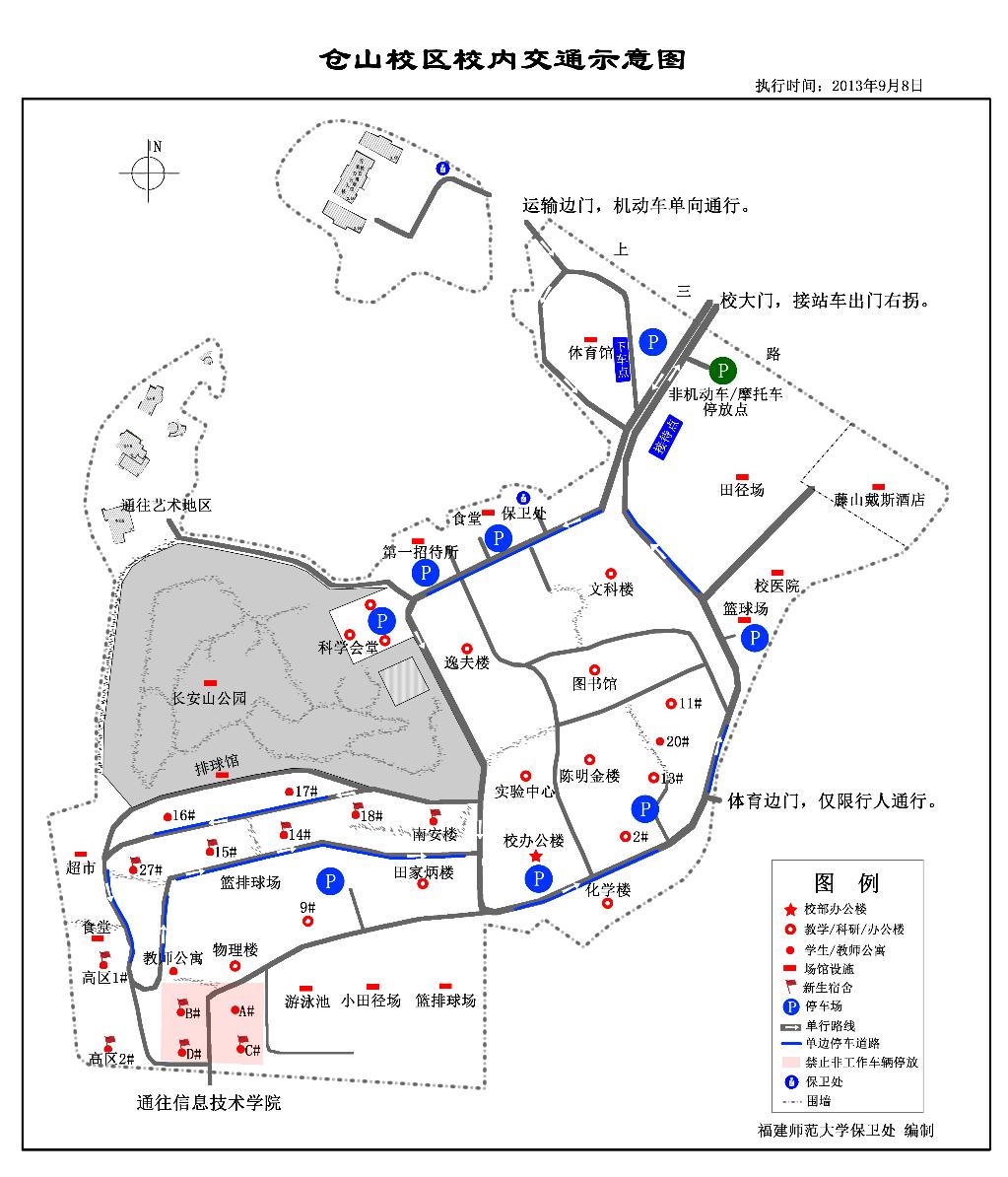 2.学校接送新生大巴从南大门进校,沿仓山大道—明德路从小东门出校门;其它机动车辆从东大门、南大门进校,从东大门、南门、小东门、接待中心小门或星槎桥出校。