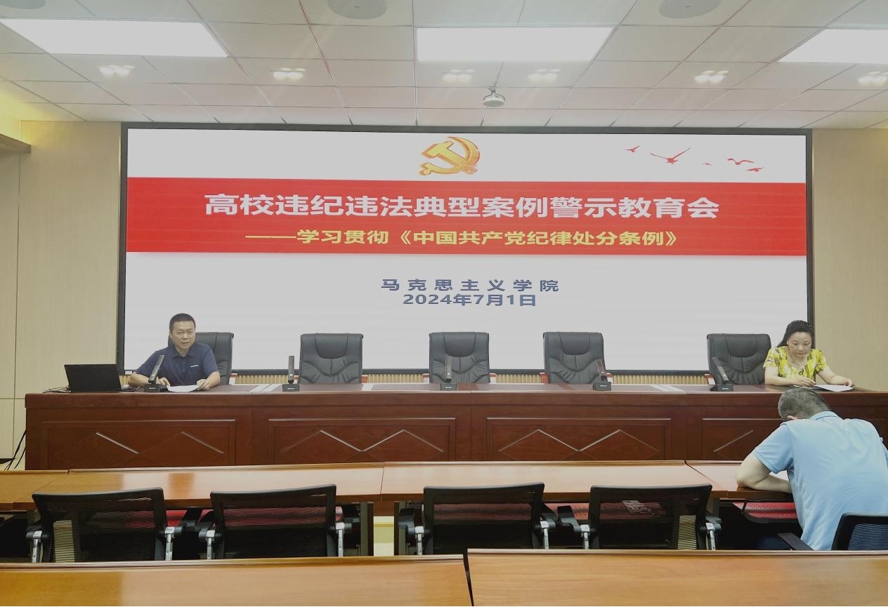 日前,马克思主义学院在学院学术报告厅召开高校违纪违法典型案例警示教育会暨师德师风建设专题会,学院党委书记阮传瞰主持,全体教职工参加会议。