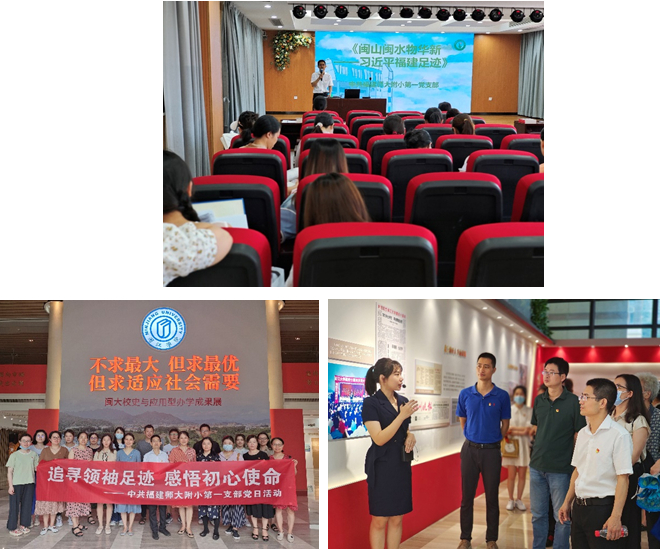 6月28日上午,附属小学第一、第二党支部分别召开专题学习研讨会,集中学习研讨《闽山闽水物华新——习近平福建足迹》,交流心得体会;7月1日上午,附小党委组织全体党员前往闽江学院,开展主题为“追寻领袖足迹,感悟初心使命”的党日活动,参观“闽大校史与运用型办学成果展”,接受党性教育和思想熏陶。活动引导广大党员干部进一步坚定理想信念,强化使命担当,潜心立德树人。大家表示,要在今后的工作中以昂扬的精神风貌和饱满的工作热情不断开拓进取,勇于创新,以优异成绩迎接党的二十大胜利召开。
