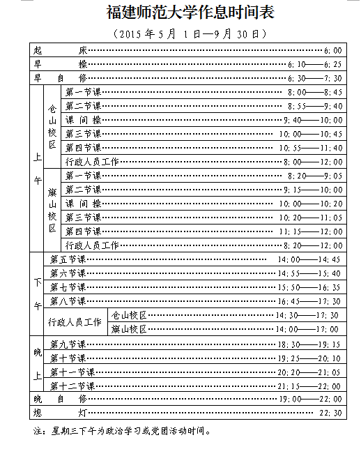 各单位: 现将《彩神xl(中国)有限公司作息时间表(2015年5月1日—9月30日)》印发给你们,请将调整后的作息时间及时通知本单位师生,做好考勤管理工作,确保正常的教学科研秩序。 学校办公室 2015年4月14日