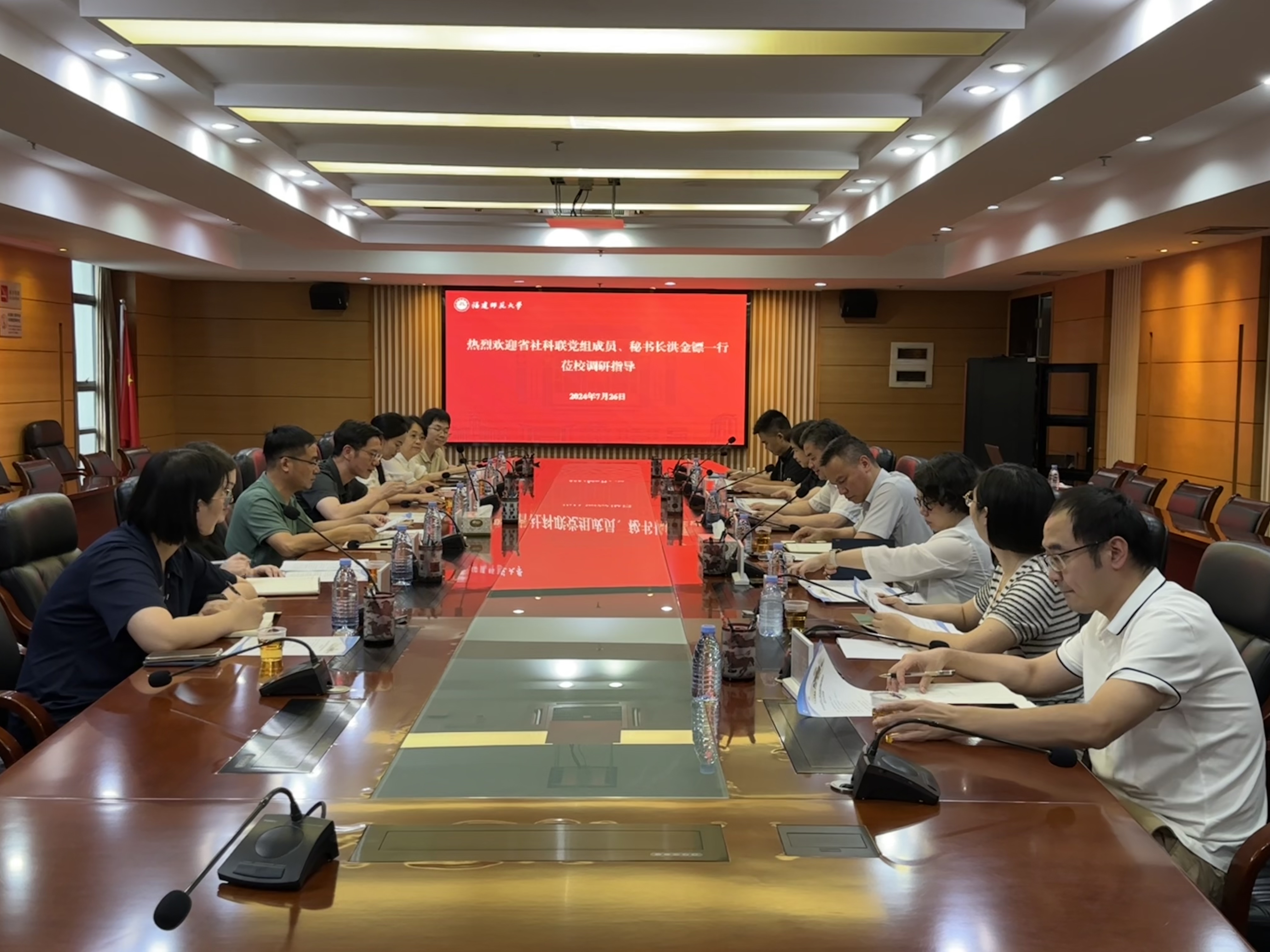 7月26日,福建省社科联党组成员、秘书长洪金镖一行来校调研哲学社会科学人才队伍建设情况,省人事人才研究所副所长王日洲随同参访。副校长吴剑锋,发展规划处、人事处(高层次人才工作办公室)、社会科学处负责人及相关工作人员参会。