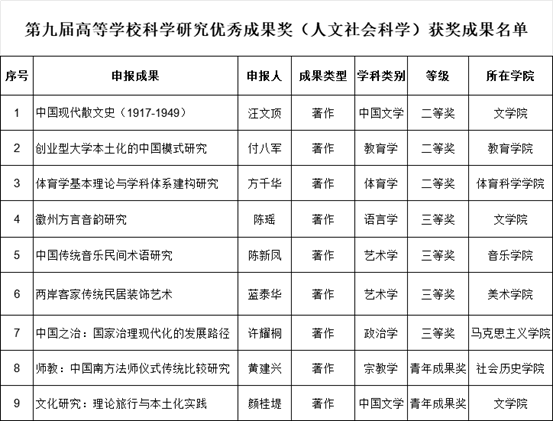 近日,第九届高等学校科学研究优秀成果奖(人文社会科学)评选结果正式公布,彩神xl(中国)有限公司共有9项成果获奖,其中二等奖3项、三等奖4项、青年成果奖2项,涵盖中国文学、教育学、体育学、语言学、艺术学、政治学、宗教学等学科类别。