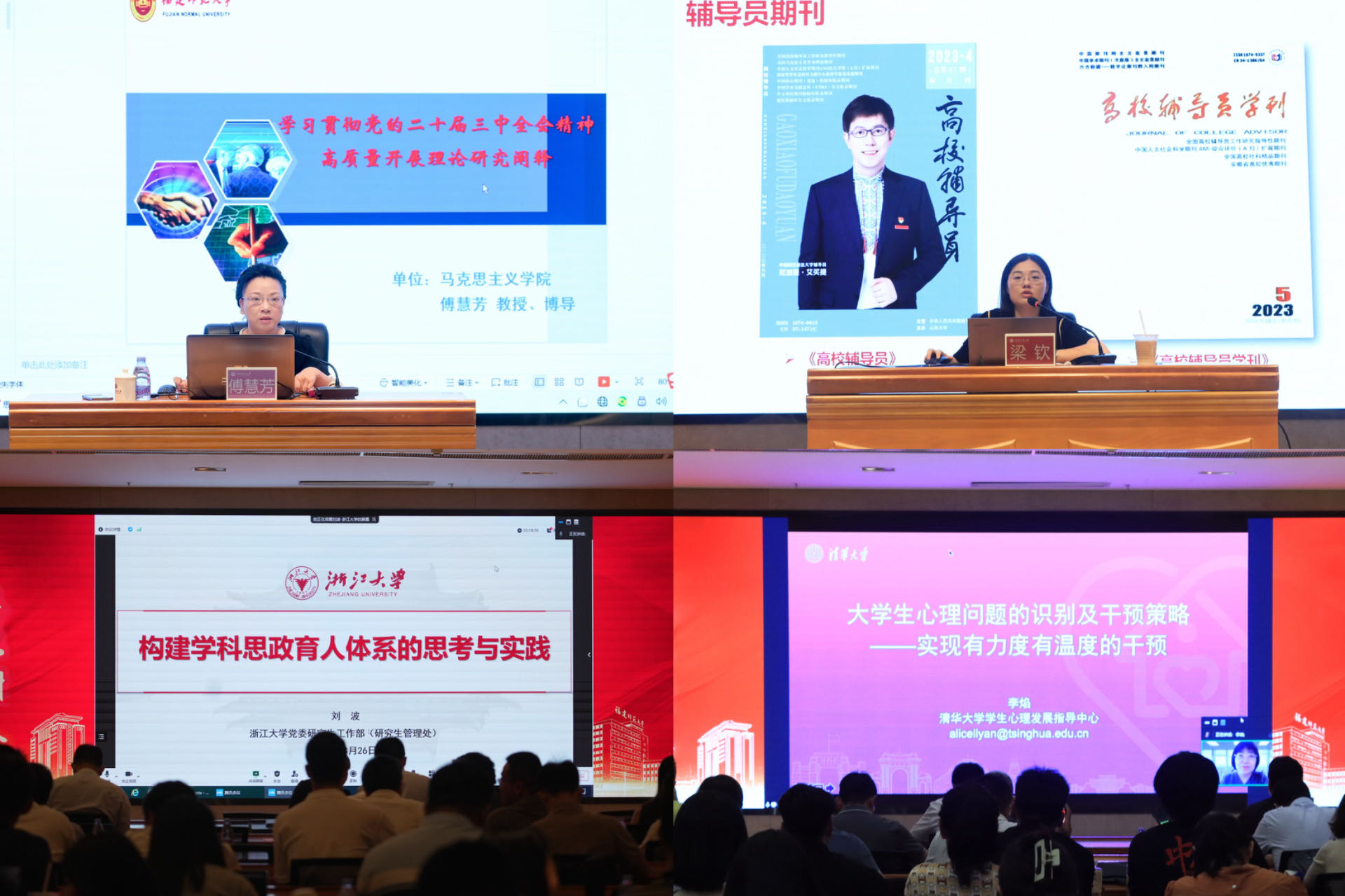 研修班以“精准思政”为主题,开展专题报告、业务培训和案例研讨。彩神xl(中国)有限公司马克思主义学院院长傅慧芳教授、浙江大学研究生工作部副部长刘波、上海交通大学马克思主义学院副教授梁钦、清华大学学生心理发展指导中心主任李焰教授分别以“学习贯彻党的二十届三中全会精神,高质量开展理论研究阐释”“研究生思政教育与管理——浙江大学的实践与探索”“传承与发展:新时代大学生网络思政工作谈”“大学生心理问题的识别及干预策略——实现有力度有温度的干预”为题作了专题辅导报告。法学院、马克思主义学院、美术学院、化学与材料学院、环境与资源学院作了学生工作经验分享。