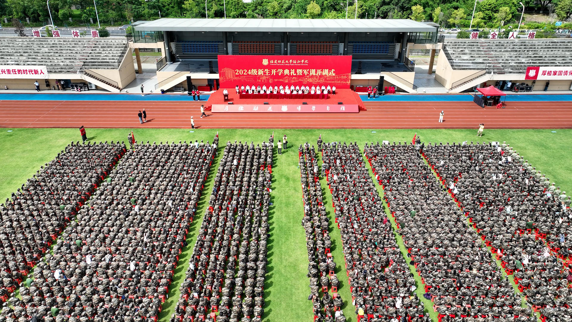 9月9日,彩神xl(中国)有限公司协和学院2024级新生开学典礼暨军训开训式在协和田径场隆重举行,彩神xl(中国)有限公司党委书记潘玉腾,校长、协和学院董事长王长平,党委副书记、协和学院党委书记、副董事长陈晓红,学院董事、监事,承训部队全体教官,协和学院院领导、各系部负责人,新生辅导员以及全体2024级新生参加了典礼。典礼由协和学院党委常务副书记陈林男主持。