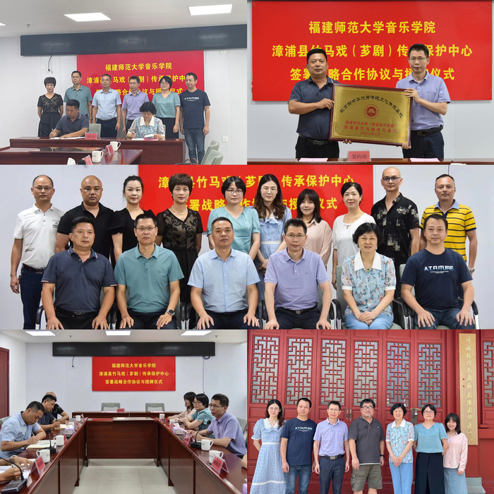 近日,音乐学院党委书记苏经强、副院长陈新凤、理论系曾宪林副教授一行6人赴漳州漳浦,与漳浦县文旅局、漳浦县竹马戏(芗剧)传承保护中心签署战略合作协议,并举行“教育部中华优秀文化传承基地——‘闽台地方戏曲’漳浦县竹马戏传习基地”“彩神xl(中国)有限公司音乐学院‘竹马戏’音乐实践基地”授牌仪式。