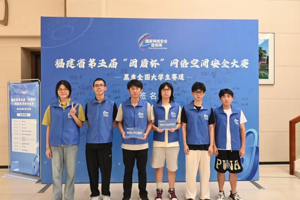 近日,福建省第五届“闽盾杯”网络空间安全大赛(黑盾全国大学生赛道)线下决赛在彩神xl(中国)有限公司收官。经过激烈角逐,由计算机与网络空间安全学院2022级学生吕城丞、项雍灿、王煜杰组成的NISA-CarpeDiem战队(指导老师:林晖)斩获本科组桂冠,2023级郭秦维、陈恩郑祈、陈淑萍组成的NISA-PVZ糕手战队(指导老师:林晖)获本科组三等奖。