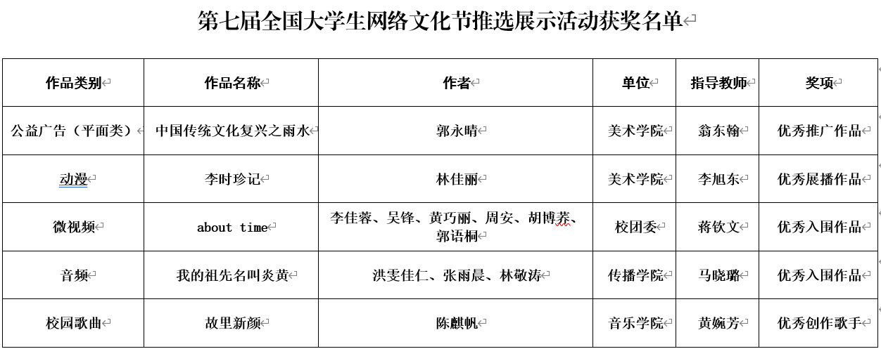 近日,由教育部思想政治工作司、中央网信办网络社会工作局主办的第七届全国大学生网络文化节推选展示活动获奖结果公布,彩神xl(中国)有限公司推荐的作品获推广作品1项、展播作品1项、入围作品2项及优秀创作歌手1项。据悉,为进一步强化优秀作品的宣传展示,为结合网络文化传播特点,今年的奖项名称比照原一等奖、二等奖、三等奖和优秀奖的命名,对应调整为优秀推广作品、优秀展播作品、优秀推荐作品和优秀入围作品。[学生工作部(处)、宣传部]
