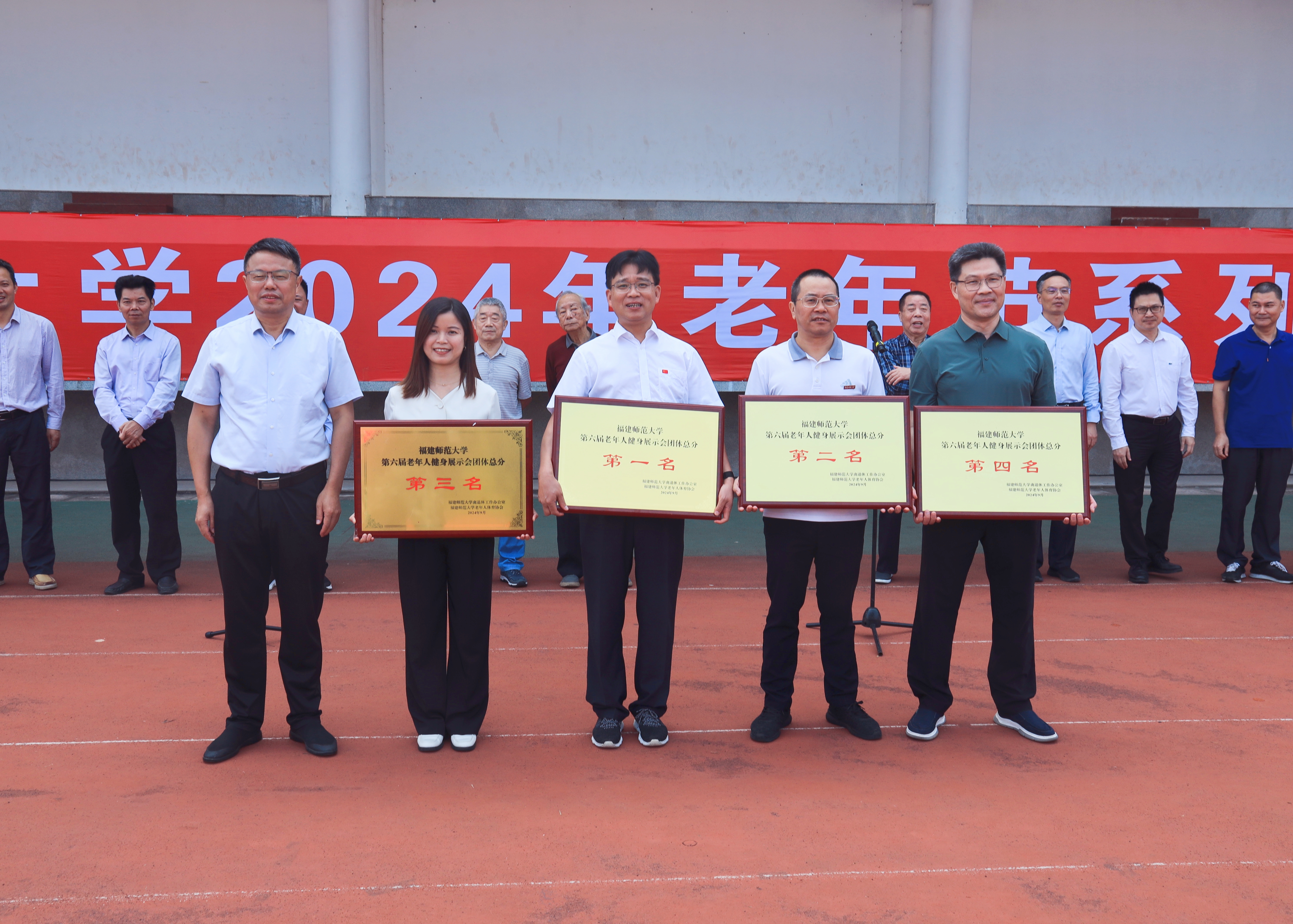 开幕式上,还表彰了校第六届离退休教职工健身展示会获得团体前十名的单位。