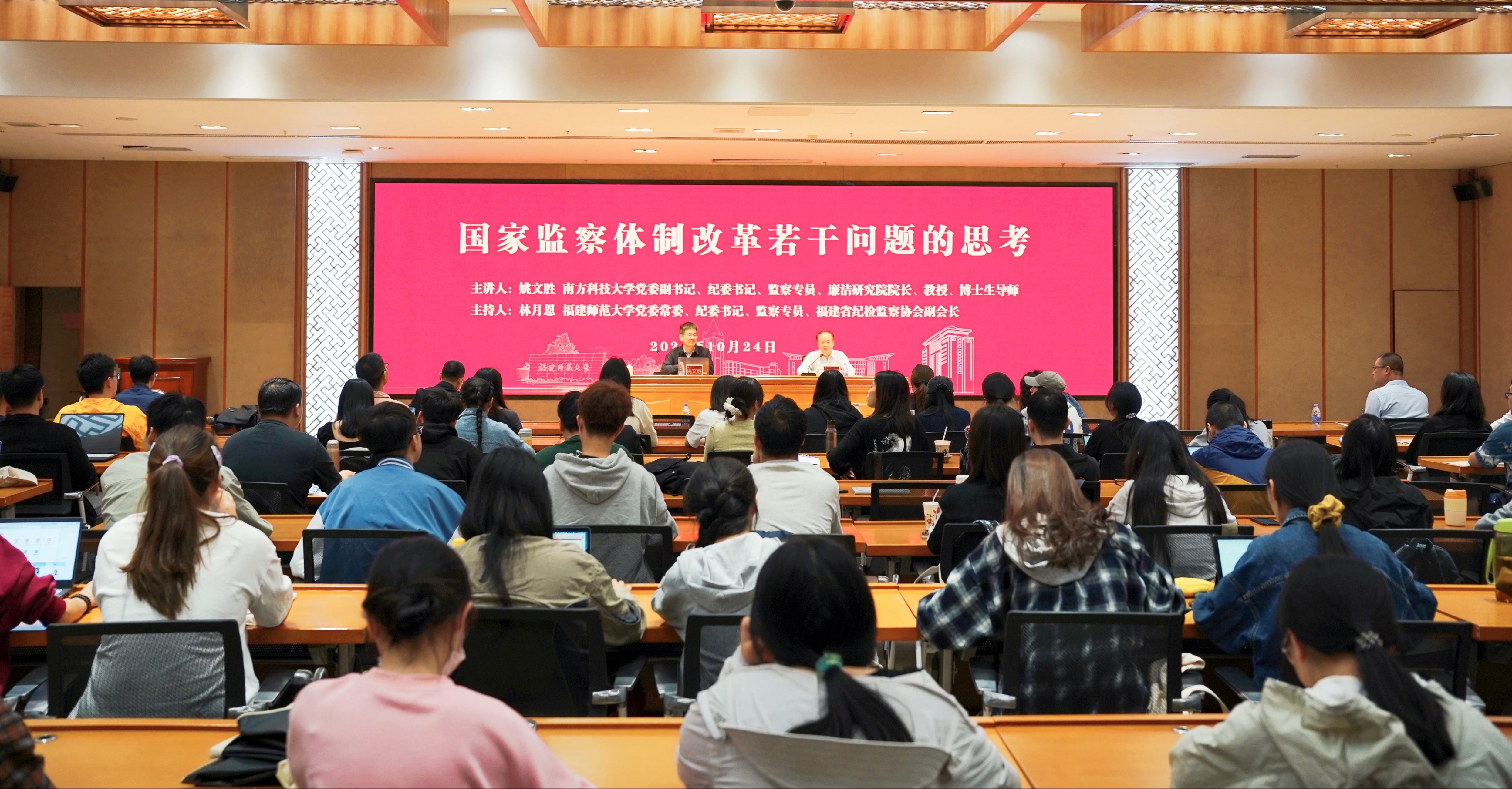 10月24日,彩神xl(中国)有限公司纪检监察讲堂在旗山校区宏达厅举办,南方科技大学党委副书记、纪委书记、监察专员、廉洁研究院院长、博士生导师姚文胜教授受邀来校作题为“国家监察体制改革若干问题的思考”的学术报告。报告会由校纪委书记、省监委驻彩神xl(中国)有限公司监察专员、省纪检监察协会副会长林月恩主持。彩神xl(中国)有限公司纪检监察机构同志,法学院、纪检监察学院师生参加报告会。