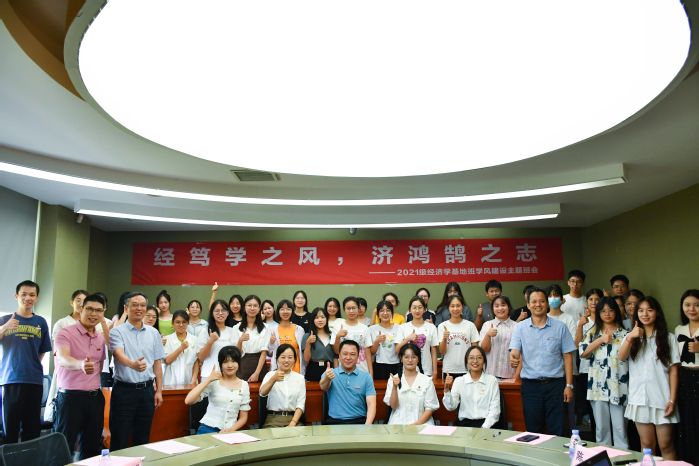 活动中,连续两年获得国家奖学金的2019级学生陈菲向同学们分享了学习的感悟与经验,基地班的同学们畅谈自己的学习目标和人生规划,纷纷表示要以陈菲学姐为榜样,勤学苦练,增强本领,努力成为可堪大用的栋梁之材。随后,吴欣芮同学代表班级作学风倡议,号召同学们明确学习目的,端正学习态度,掌握学习方法,勇攀学习高峰。班主任张宝英结合自己在经济学基地班的求学经历,鼓励同学们时刻关心国家大事,敢于面对困难挫折,做到身心健康发展。同学们还向涂荣副书记、张宝英老师赠送了2021级经济学基地班班级通讯录。