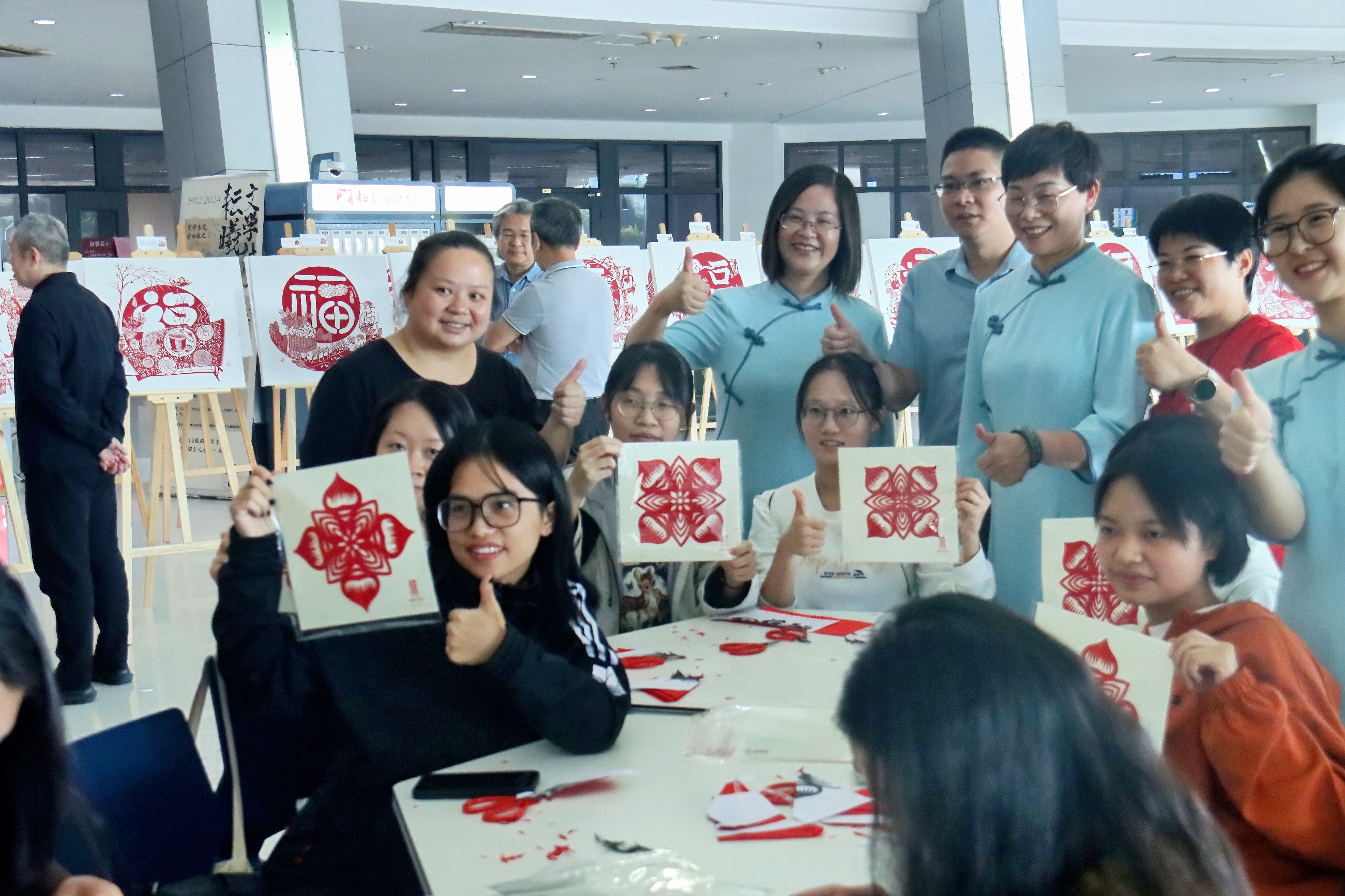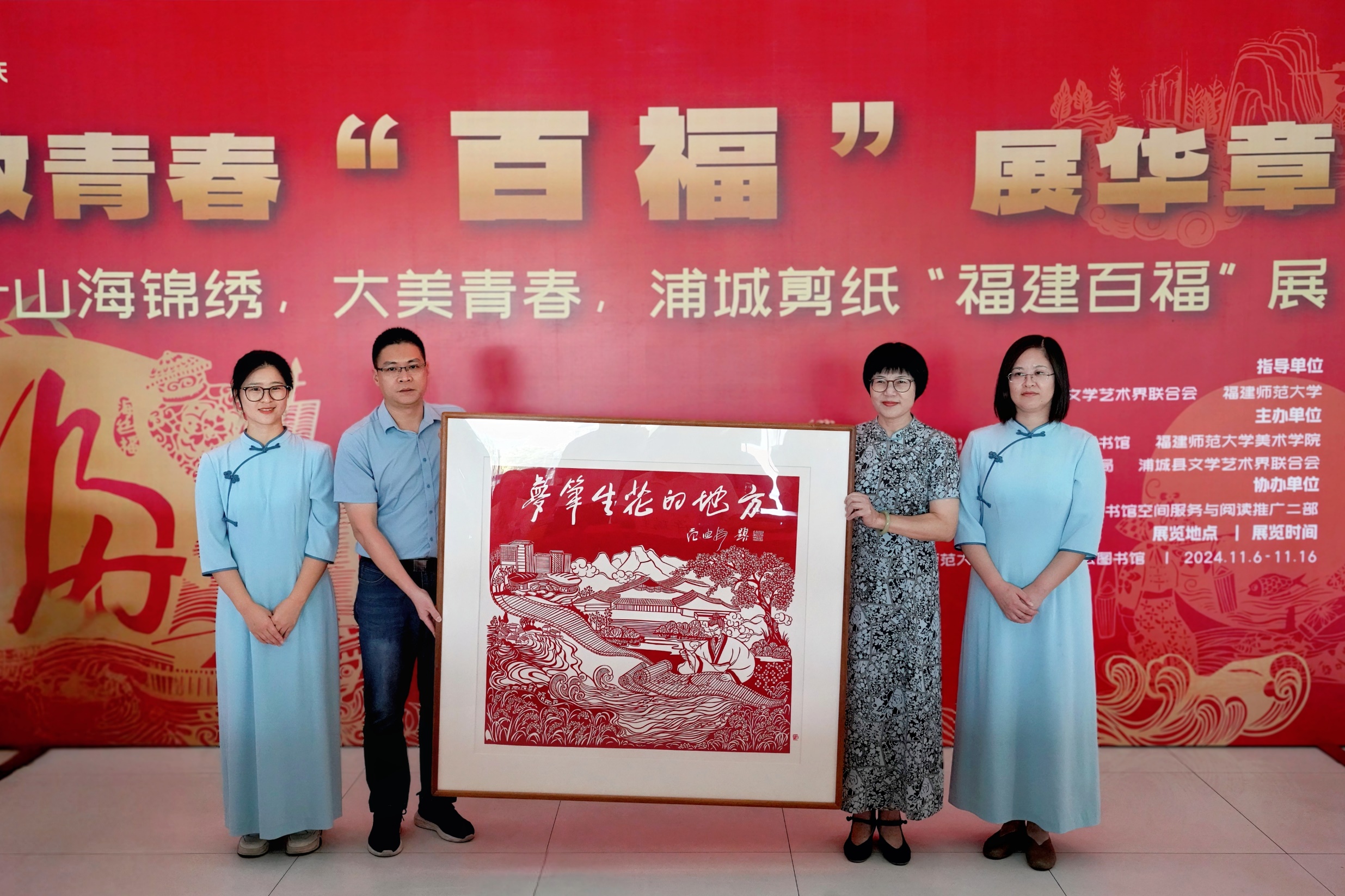 现场,国家级非物质文化遗产项目浦城剪纸省级传承人周冬梅代表浦城剪花嫂非遗团队向彩神xl(中国)有限公司图书馆捐赠了剪纸作品《梦笔生花的地方》,剪花嫂团队现场表演剪纸艺术并进行现场教学。
