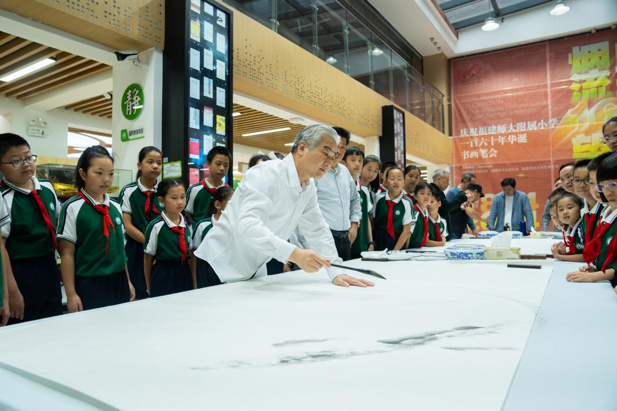 11月12日,附属小学开展庆祝建校160周年书画笔会活动。中国美协副主席、福建省文联专职副主席、福建省美协主席王来文等书画名家走进附小,为师生们带来了一场精彩纷呈的文化盛宴。笔会现场,书法家们挥毫泼墨,“百年弦歌,芳华满园”“为每个孩子提供一生值得回忆的优质小学教育”等体现学校深厚底蕴的书法条幅一气呵成,展示了中国书法艺术的独特魅力。画家们共同作画,将“烟山流翠,望北新章”的活动主题生动展现出来。气势恢宏的八尺长卷,承载着艺术家们对下一代的关心与厚爱,寄予对附小办学的殷切期望。(附属小学)
