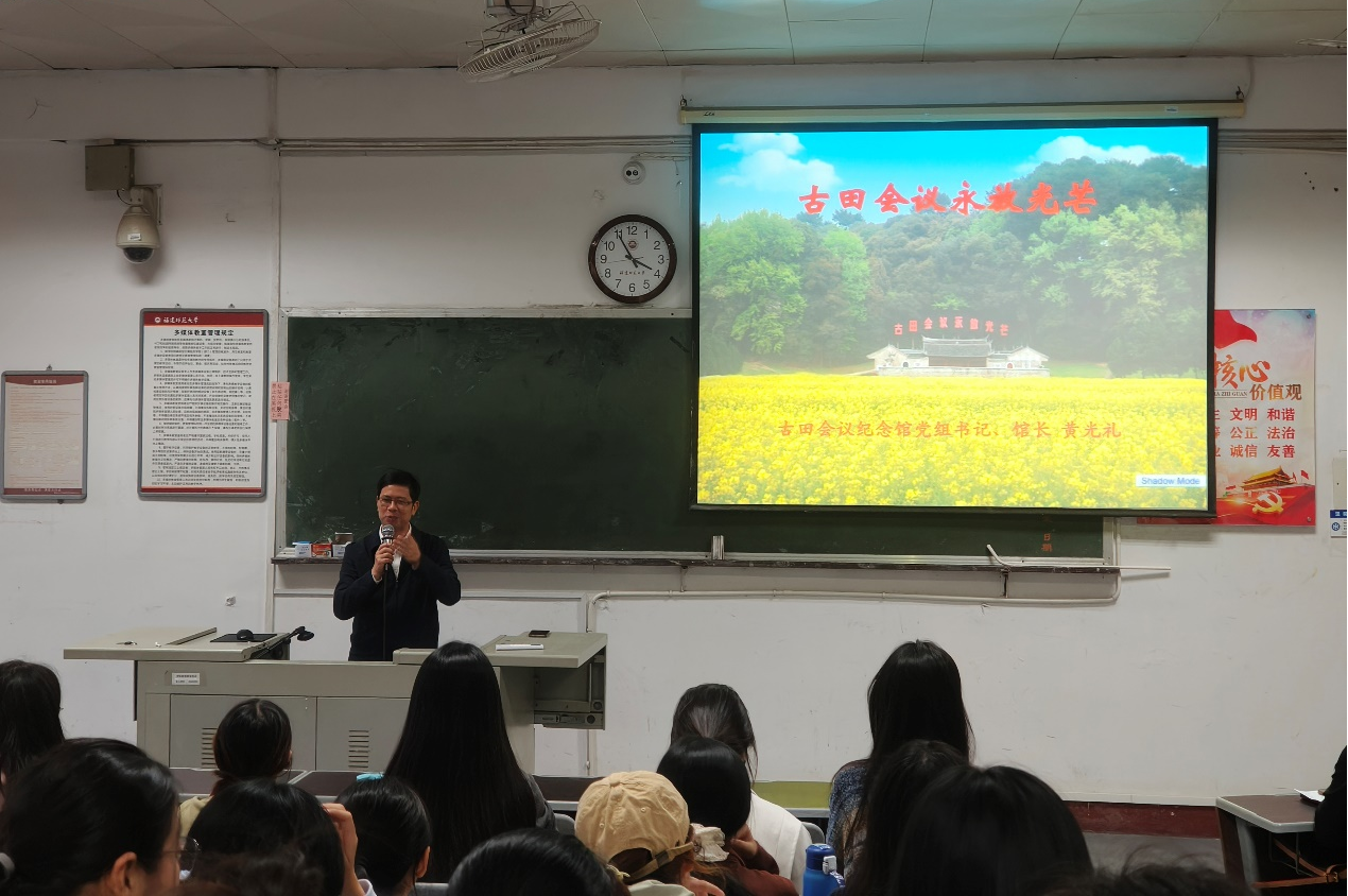11月19日下午,马克思主义学院“大思政课”实践教学基地教师进校园讲思政课首场活动在仓山校区举行。古田会议纪念馆党组书记、馆长,龙岩市委党校副校长(兼)、龙岩行政学院副院长(兼)黄光礼,受邀以“古田会议永放光芒”为主题,为文学院100余名本科生带来了一场别开生面的“大思政课”。