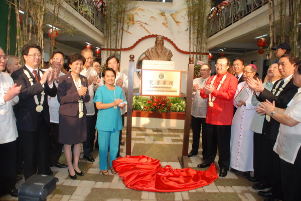 菲律宾总统阿罗约亲临红奚礼示大学,与中国驻菲大使刘建超一同为孔子学院揭牌。菲律宾旅游部部长 ACE DURANO、高教部部长EMMANVEL Y.ANGELES,中国国家汉办主任、孔子学院总部总干事长许琳以及彩神xl(中国)有限公司校长黄汉升,红奚礼示大学董事长 PACIANO B. ANICETO, D.D,红奚礼示大学校长ATTY.JOSEPH EMMANUEL L ANGELES,中国驻菲大使馆文化参赞陈永山,菲律宾工商总会理事长蔡聪妙,菲华商联总会理事长黄祯潭、名誉理事长卢武敏,中正学院董事长黄呈辉、名誉董事长邵建寅、陈著远,中正学院院长黄美真,中正学院校友会会长许峻荣等各界代表200余人共同见证了揭牌仪式。