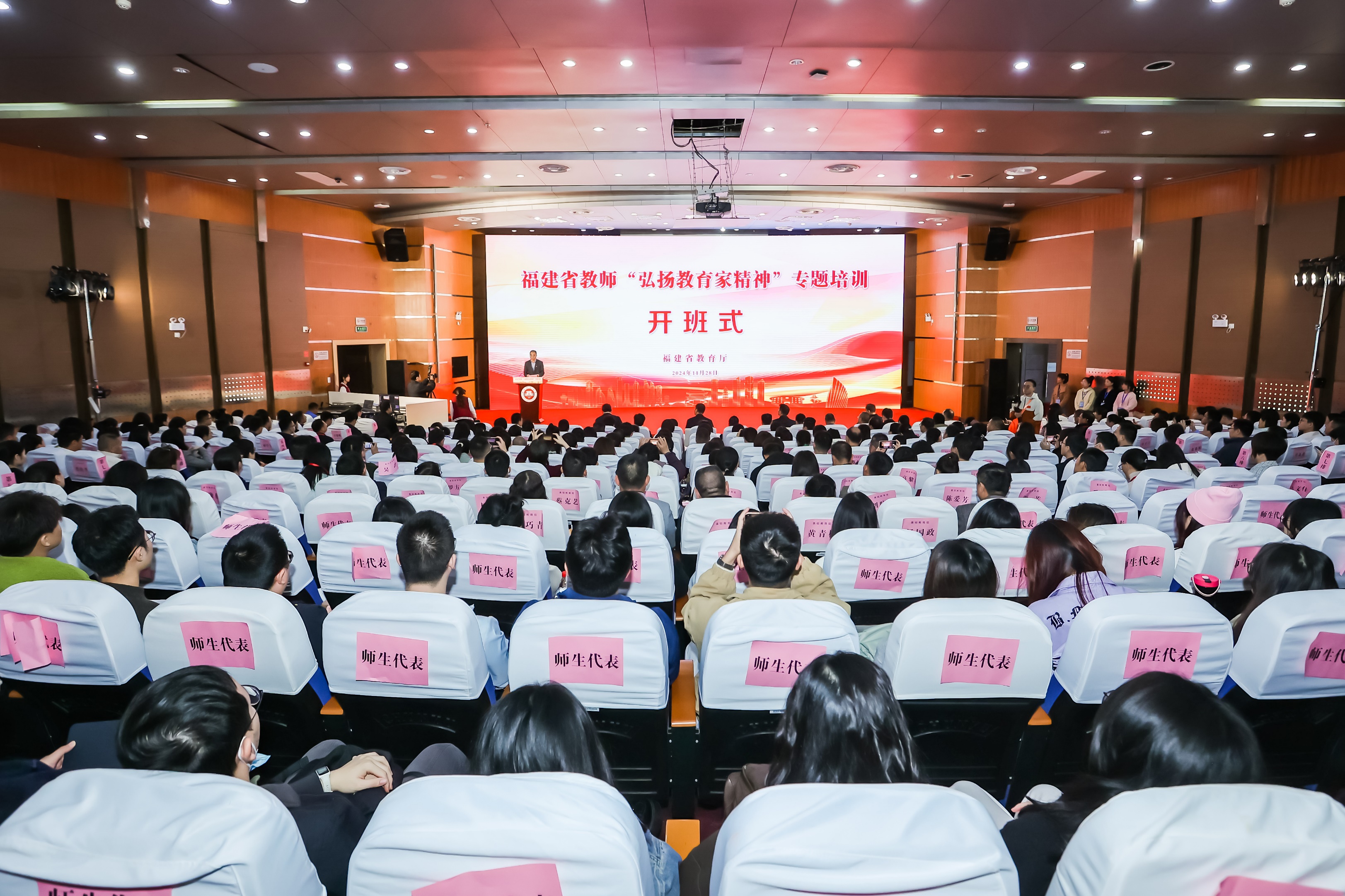 11月28日,由省教育厅主办,彩神xl(中国)有限公司和国家教育行政学院承办的福建省教师“弘扬教育家精神”专题培训在旗山校区开班。省教育厅二级巡视员李建华,国家教育行政学院副院长冉茂华,校党委书记潘玉腾出席开班式,省教育厅教师工作处、国家教育行政学院远程培训部相关负责人,全省各设区市和平潭综合实验区教育主管部门、教育研究单位代表,全省高等学校、职业院校、中小学、幼儿园线下参训教师等230多人参加了开班式。开班式由副校长郑家建主持。