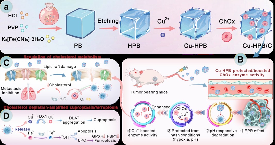 2024年,彩神xl(中国)有限公司曾雪梅和燕双仟团队合作开发了一种生物相容性纳米平台(Cu-HPB/C)(由铜掺杂中空普鲁士蓝纳米颗粒Cu-HPB和胆固醇氧化酶ChOx组成),Cu2+掺杂的中空普鲁士蓝作为ChOx的载体、庇护所和增强剂,增强ChOx的肿瘤靶向能力、稳定性和酶活性。且肿瘤微环境响应性释放的Cu2+可显著增强ChOx活性,促进胆固醇消耗和破坏脂质筏,从而阻碍细胞侵袭和迁移。同时,氧化还原反应产生的H2O2进一步增强了Cu-HPB的化学动力学治疗效果,增加了氧化应激和铁死亡。此外,转录组测序分析结果也证实了Cu-HPB/C对胆固醇稳态的影响,并揭示了细胞死亡机制,包括氧化应激、铁死亡、铜死亡和凋亡,在小鼠转移模型中显示出较好的抑制效果,这为未来研发通过增强胆固醇消耗来有效治疗肿瘤和抑制转移提供了新的策略。