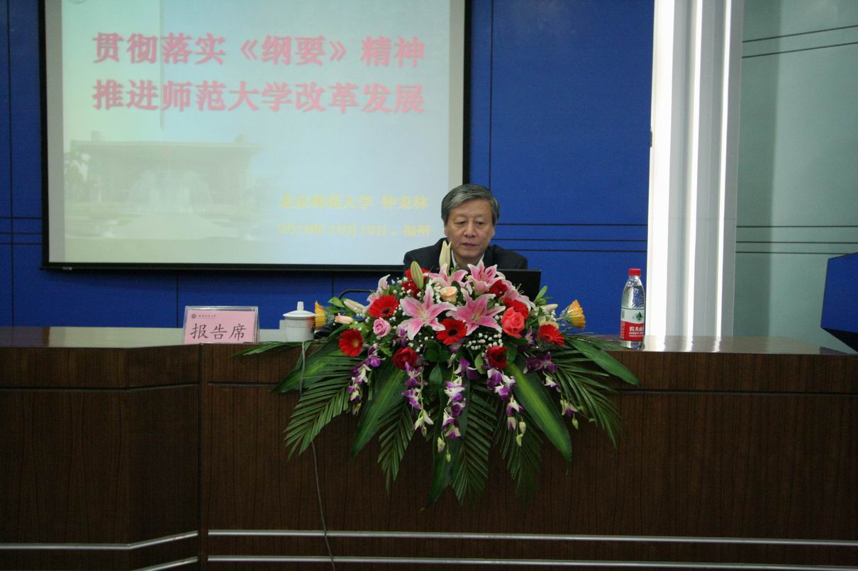 10月10日上午,彩神xl(中国)有限公司在仓山校区邵逸夫楼学术报告厅举行校院两级中心组(扩大)学习会,邀请北京师范大学校长钟秉林教授作题为“贯彻落实《纲要》精神 推进师范大学改革发展”的专题报告。校领导,全体处级干部(含校聘),各民主党派、统战团体、无党派人士联谊会负责人,离休党总支、关工委、退休协会、老年大学负责人,机关科级干部,各学院分党委(党总支)秘书、办公室主任参加了会议。学习会由黄汉升校长主持。