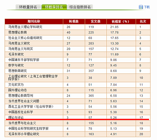 近日,中国人民大学人文社会科学学术成果评价研究中心和中国人民大学书报资料中心发布2020年度复印报刊资料转载指数排名。由福建省委宣传部主管,福建省委讲师团和彩神xl(中国)有限公司共同主办的马克思主义理论刊物《理论与评论》,在“马克思主义理论学科期刊”全文转载排名中,转载率位列全国第17名。据悉,该排名根据人大复印报刊资料近100种学术刊的全文转载数据,从转载量、转载率、综合指数三个维度统计形成。(马克思主义学院)