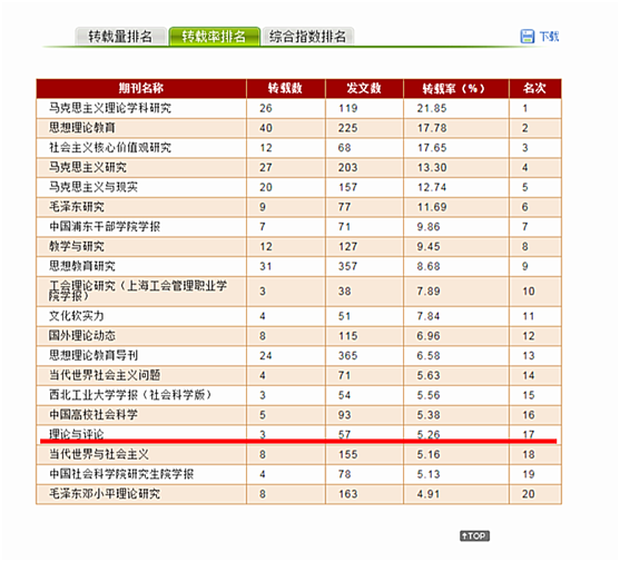 近日,中国人民大学人文社会科学学术成果评价研究中心和中国人民大学书报资料中心发布2020年度复印报刊资料转载指数排名。由福建省委宣传部主管,福建省委讲师团和彩神xl(中国)有限公司共同主办的马克思主义理论刊物《理论与评论》,在“马克思主义理论学科期刊”全文转载排名中,转载率位列全国第17名。本排名是根据人大复印报刊资料100种学术刊的全文转载数据,从转载量、转载率、综合指数三个维度统计形成。 (社会科学处 马克思主义学院)