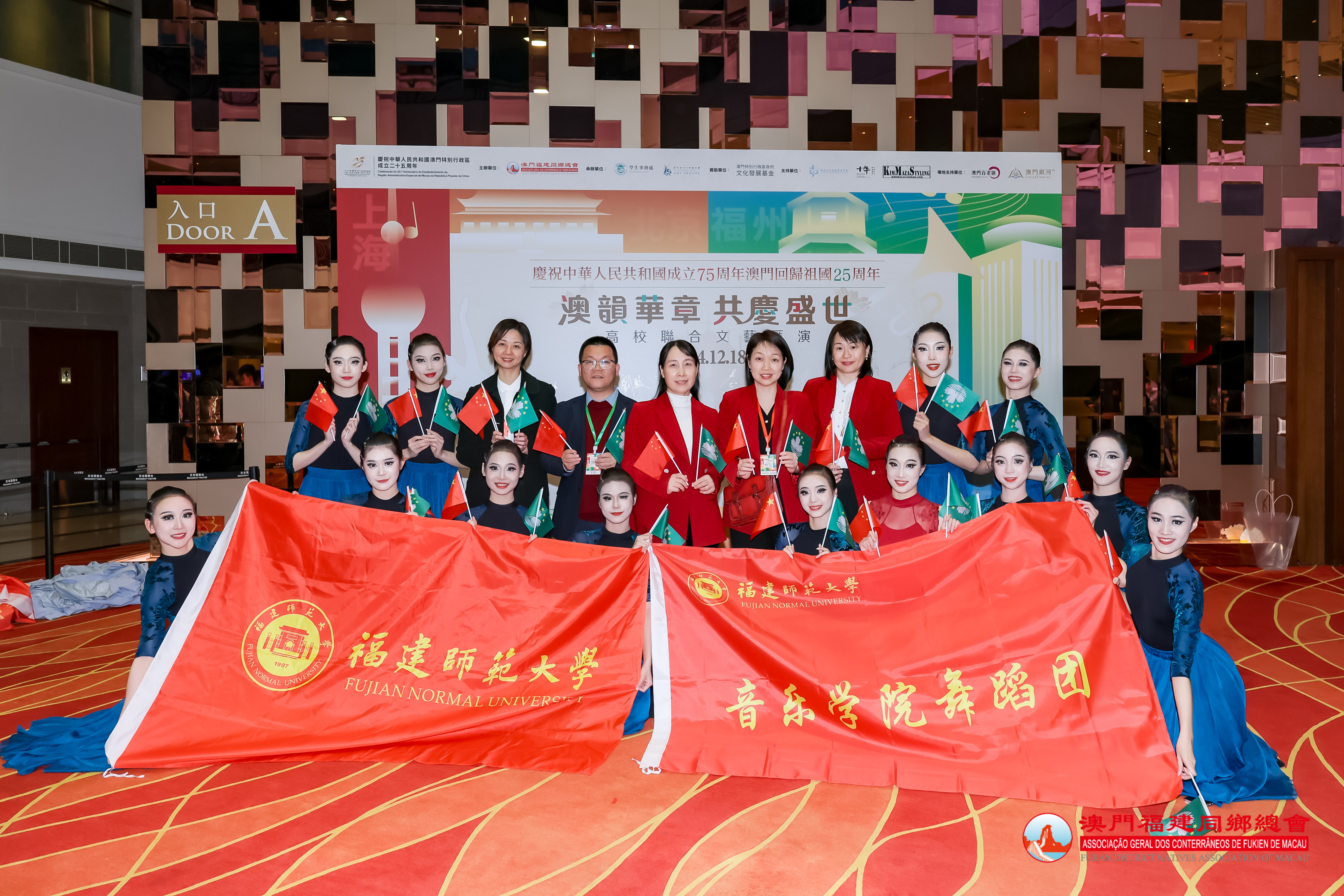 为庆祝中华人民共和国成立75周年、澳门回归祖国25周年,12月18日,彩神xl(中国)有限公司音乐学院舞蹈团应邀赴澳门参加由澳门福建同乡总会主办,澳门城市大学艺术团承办的“澳韵华章 共庆盛世”高校联合文艺汇演。彩神xl(中国)有限公司音乐学院表演了原创群舞《潮起东南》,充分展现了高超的艺术水平和昂扬的精神面貌。