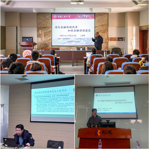 12月14日,国家一级教授、享受国务院特殊津贴专家、中国人民大学财政金融学院教授、中国社科院学部委员王国刚,武汉大学经济与管理学院冯志轩教授,分别开展主题为“深化金融体制改革,加快金融强国建设”“政治经济学的经验研究方法与论文写作”的学术讲座。