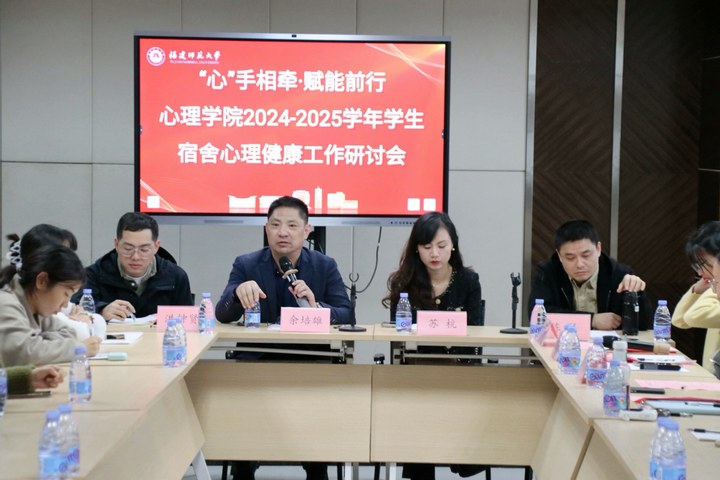 近日,心理学院与巡察办在人文楼召开“心手相牵·赋能前行”学生宿舍心理健康工作研讨会。巡察办常务副主任余培雄、心理学院党委副书记苏杭、应用心理学系主任陈坚以及相关老师参加。