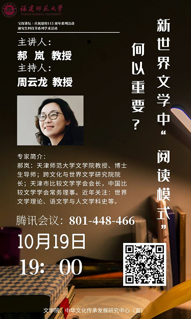 时间:2022年10月19日(周三)19:00地点:腾讯会议:801-448-466主讲:郝岚,天津师范大学,教授主办:中华文化传承发展研究中心、文学院专家简介:郝岚,天津师范大学文学院教授、博士生导师;跨文化与世界文学研究院院长;天津市比较文学学会会长,中国比较文学学会常务理事。近年关注:世界文学理论、语文学与人文学科史等。