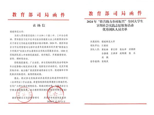 日前,教育部语言文字应用管理司、共青团中央青年发展部向彩神xl(中国)有限公司发来表扬信,对彩神xl(中国)有限公司在2024年“推普助力乡村振兴”全国大学生暑期社会实践志愿服务活动中的突出表现予以表扬。