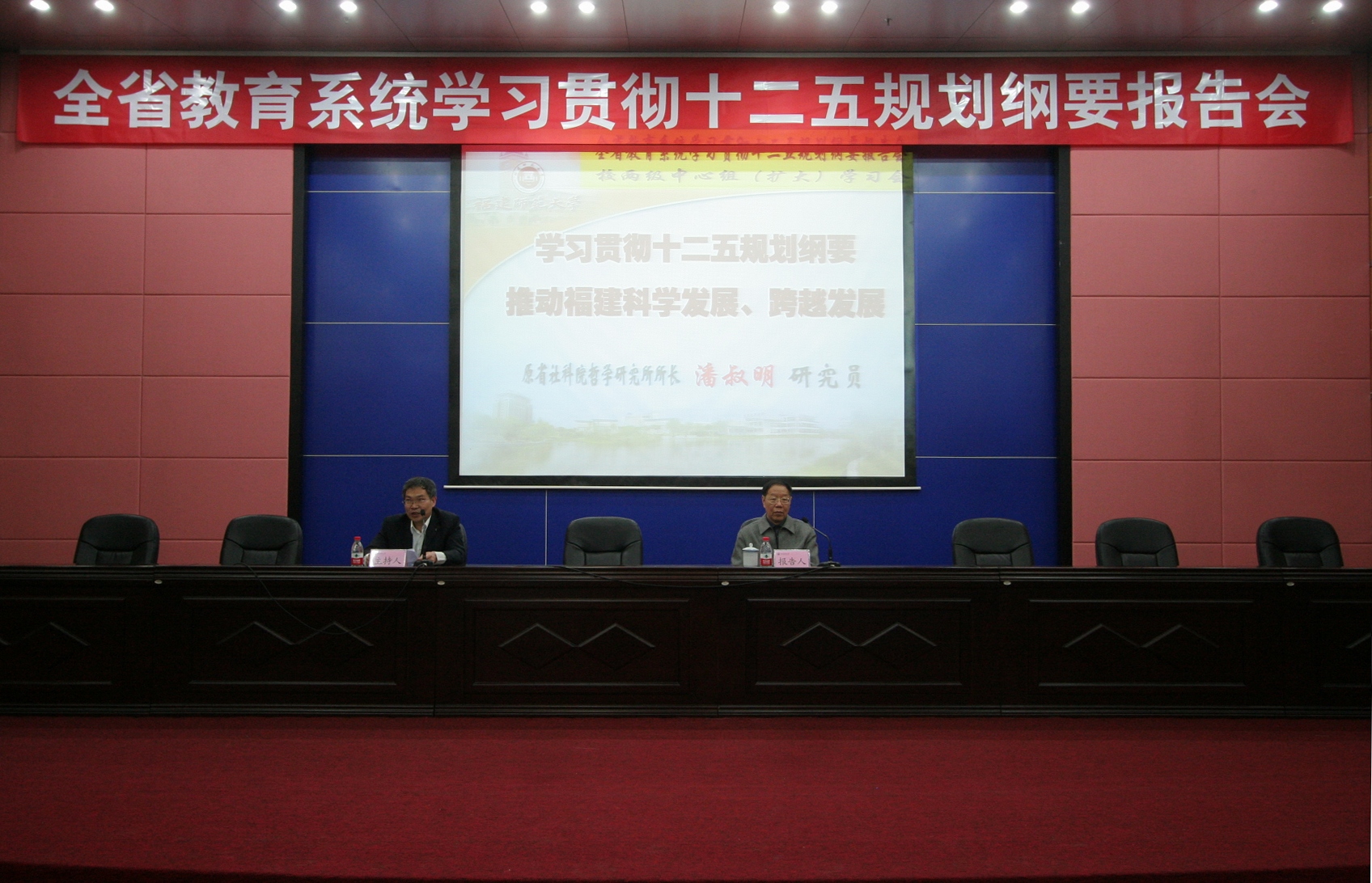 报告中,潘叔明研究员结合自己的研究和我省实际,从发展的历史机遇、发展主题、发展方式以及我国、我省教育规划纲要的主要精神和目标任务四个方面就如何深入学习贯彻十二五规划纲要,推动福建科学发展、跨越发展,进行了全面解读和深入分析。报告内容丰富,深入浅出,精彩生动,具有很强的感染力。