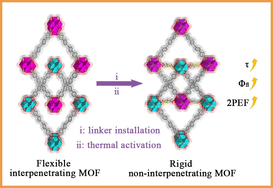 近日,彩神xl(中国)有限公司张亮亮副教授、中山大学潘梅教授和湖南大学方煜教授合作,合成了一种基于四苯乙烯(TPE)的柔性互穿Zr-MOF材料。通过引入两种不同长度的第二配体,构筑了两种不同刚性化结构的新材料。配体后修饰策略可以在不改变MOF框架结构的情况下调节材料的孔环境、结构刚性、堆积密度和功能性。进一步的热活化后,材料的荧光发生红移,单/双光子吸收截面提高,量子产率和荧光寿命增加。