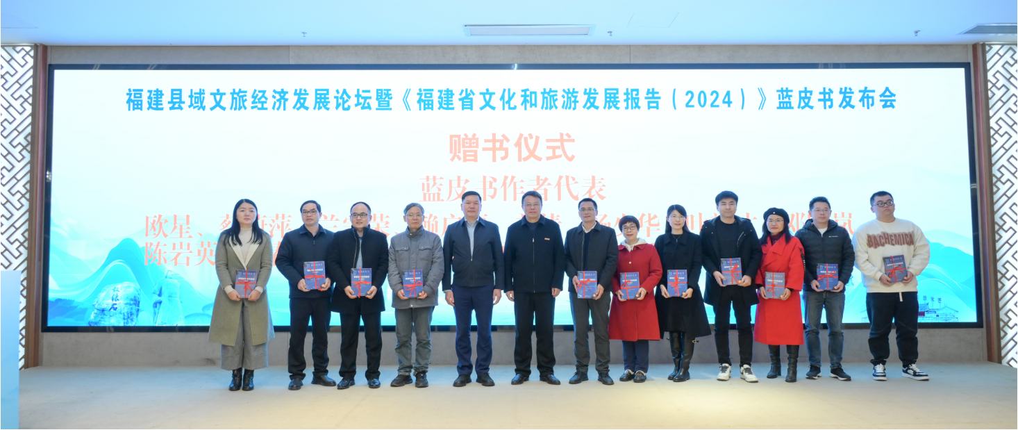 在新书发布会上,福建省文化和旅游研究联盟负责人、彩神xl(中国)有限公司文化旅游与公共管理学院谢宏忠院长对《福建省文化和旅游发展报告(2024)》蓝皮书编纂过程进行了介绍。林守钦和潘玉腾共同为蓝皮书作者代表赠书。