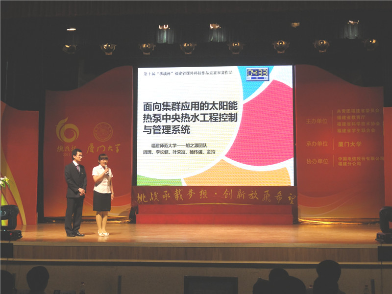 获得一等奖的2件作品分别是:《从两型社会到低碳城市建设的构想与探索——以福建省为例》(经济学院,作者:经济学院邱伟杰、柳子昂、李师源,指导老师:黄茂兴、陈文、郑元凯)和《面向集群应用的太阳能热泵中央热水工程控制与管理系统设计》(软件学院,作者:软件学院周琦、叶荣富、李长键,应用科技学院杨伟强、经济学院金持,指导老师:蔡声镇、卢宇)。