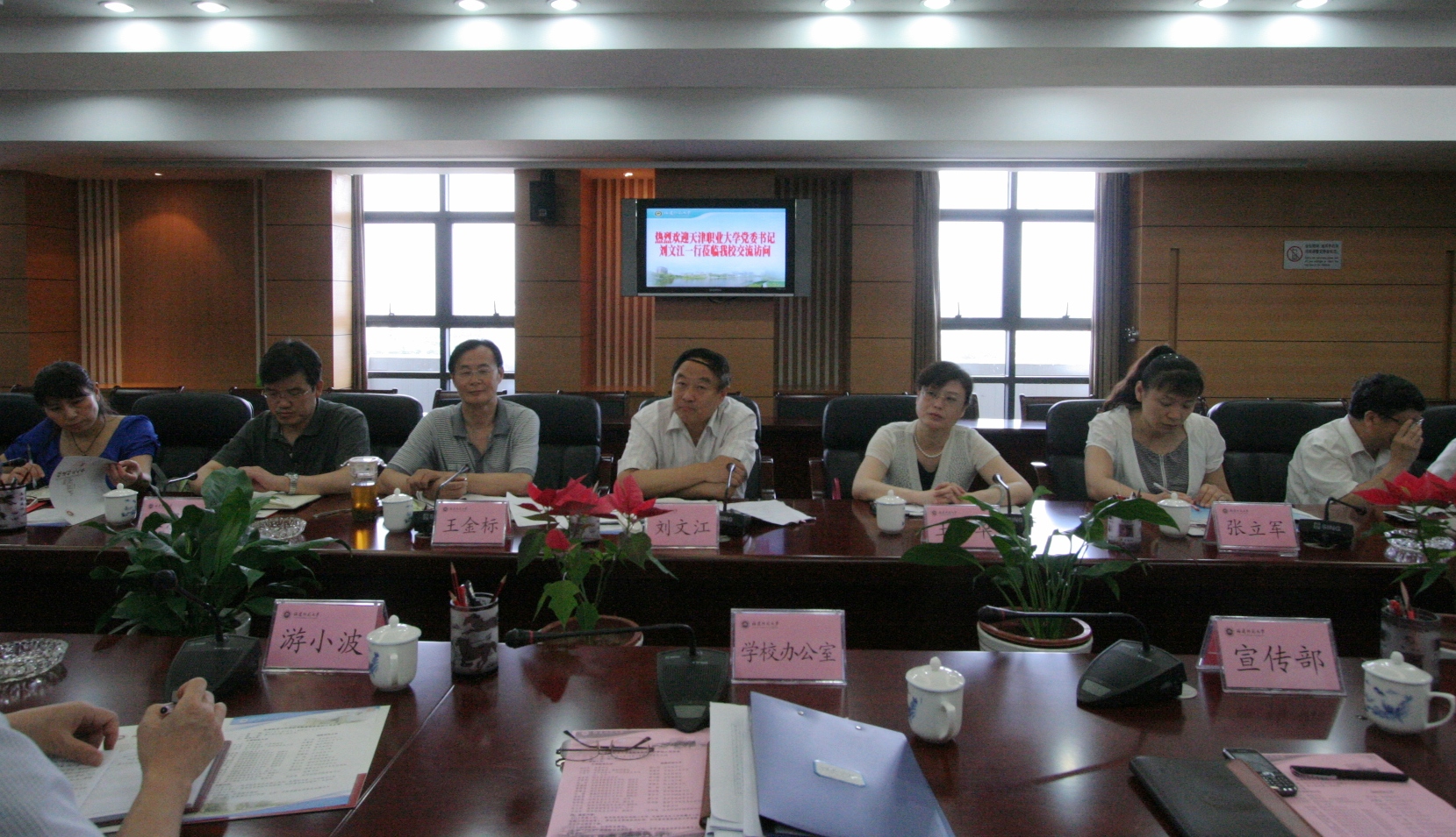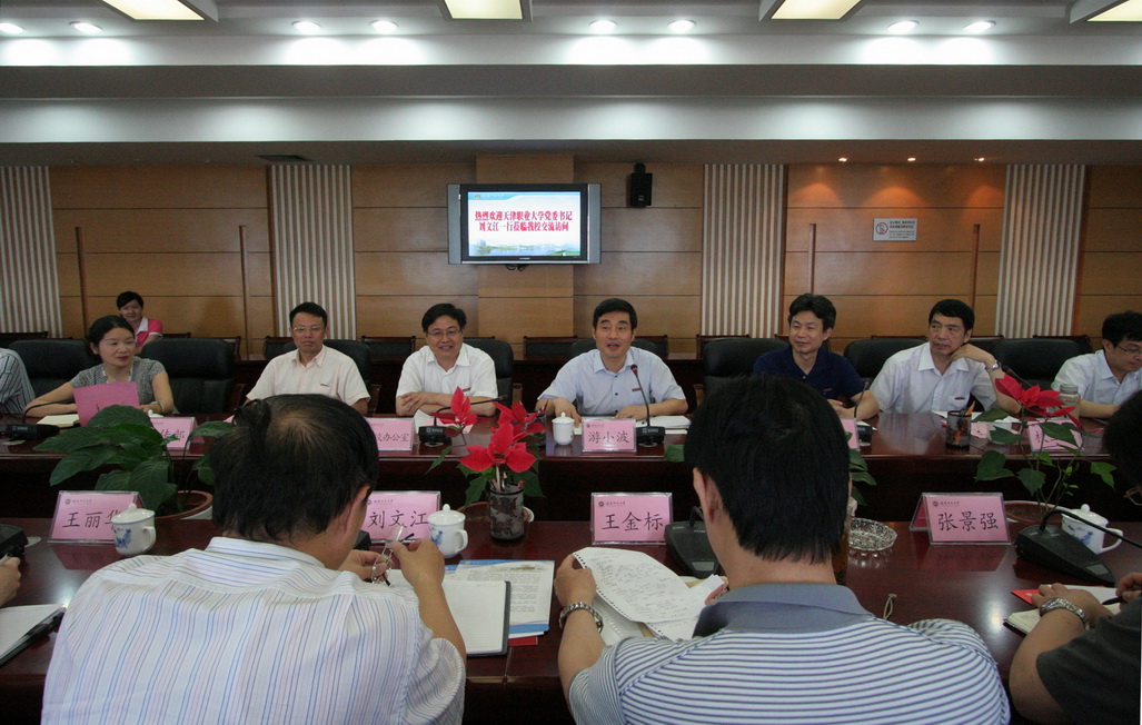 6月10日上午,天津职业大学党委书记刘文江,党委常委、组织部部长王金标一行16人来校考察交流。校党委副书记游小波,学校办公室、组织部、宣传部、校工会、机关党委、人事处、图书馆、经济学院、美术学院、物理与光电信息科技学院、应用科技学院等单位负责人参加了座谈会。