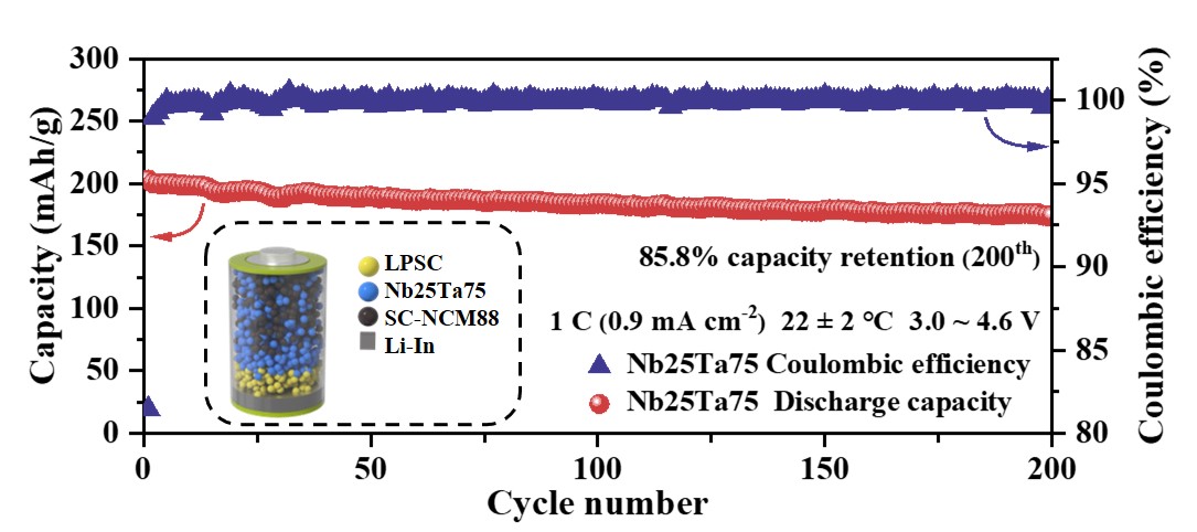 研究成果以《Enabling High-Voltage Stability and Interface Compatibility via Ta/Nb Co-Occupation in Fluorinated Li-Halide Catholytes》为题发表于学术期刊《Energy Storage Materials》。彩神xl(中国)有限公司为成果第一单位,彩神xl(中国)有限公司硕士研究生林巧全为第一作者,张隆、黄志高教授以及燕山大学博士生姚景明为共同通讯作者。研究工作得到国家自然科学基金资助。