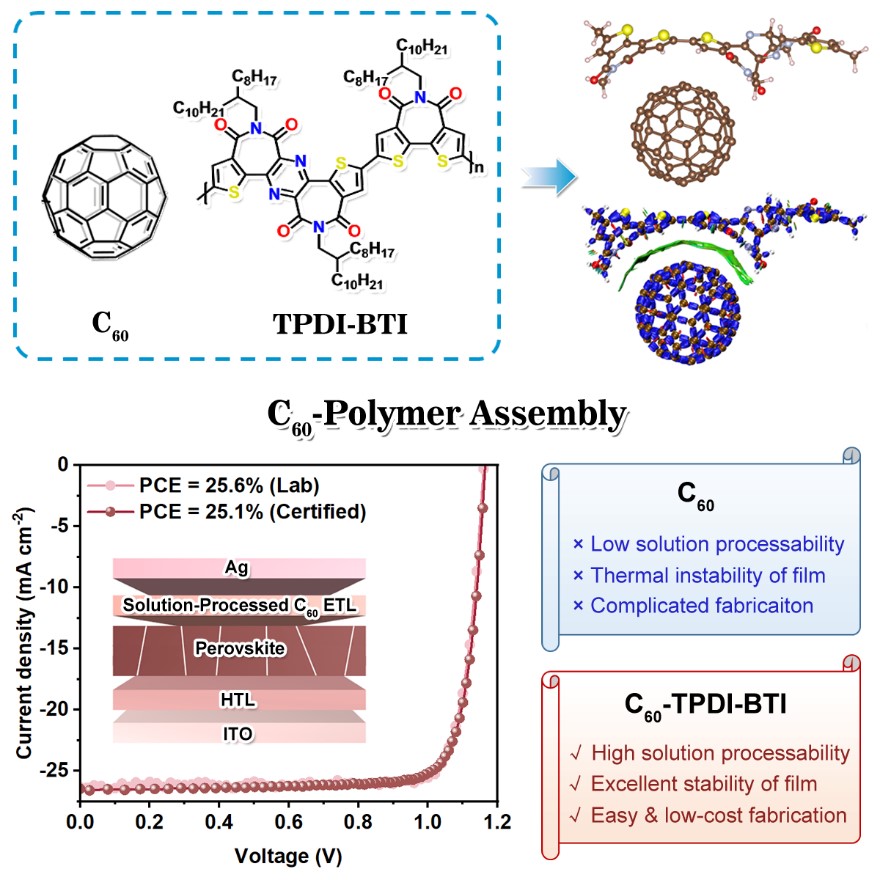 鉴于此,彩神xl(中国)有限公司化学与材料学院邢舟副教授、海峡柔性电子学院安明伟副教授和南方科技大学郭旭岗教授团队、洛桑联邦理工学院夏建兴/Nazeeruddin教授团队合作,设计并合成一种n型聚合物TPDI-BTI用于和C60液相组装高效、稳定的电子传输层。得益于该分子柔软的链状骨架、理想的分子间化学作用和电子能级匹配,TPDI-BTI不仅可以插入相邻碳笼之间抑制碳笼团聚,而且可以调控碳笼的电子传输和薄膜的界面化学作用。基于C60-TPDI-BTI的钙钛矿电池表现出25.6%的光电转化效率(第三方权威认证25.1%),为目前该类钙钛矿电池的最优性能。同时,在2000小时的光照老化和800小时的高温老化后,电池仍能保持很好的光伏性能。研究成果以《Solubilizing and Stabilizing C60 with n-Type Polymer Enables Efficient Inverted Perovskite Solar Cells》为题发表于能源领域国际顶级期刊《Joule》上,这项工作突破了高性能C60电子传输层只能通过真空热蒸发法制备的局限性,对全液相法制备高效、稳定钙钛矿电池具有重要意义。