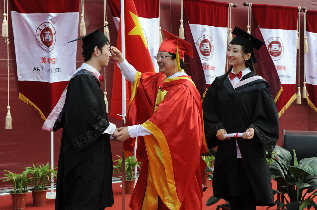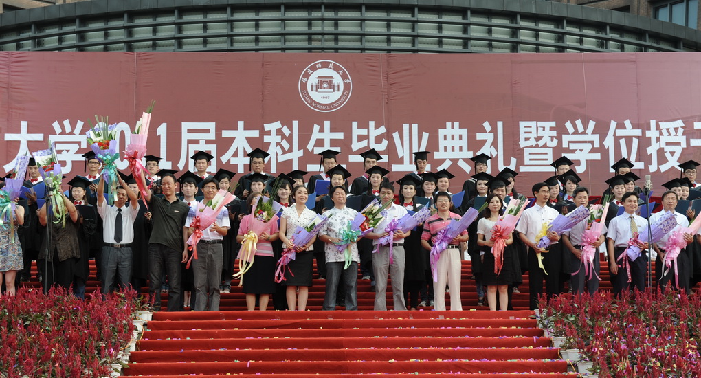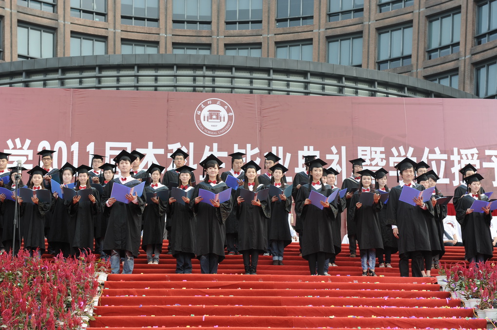 学位授予仪式上,黄汉升校长亲自为每一位2011届本科毕业生执行“拨穗礼”,还不时与毕业生合影留念。当毕业生们手持学位证书、身着学位服,步履轻盈、满怀豪情地走向典礼台时,年轻的脸上写满了自豪和骄傲,全场四起的掌声和不绝于耳的欢呼声,洋溢着深深的祝福。