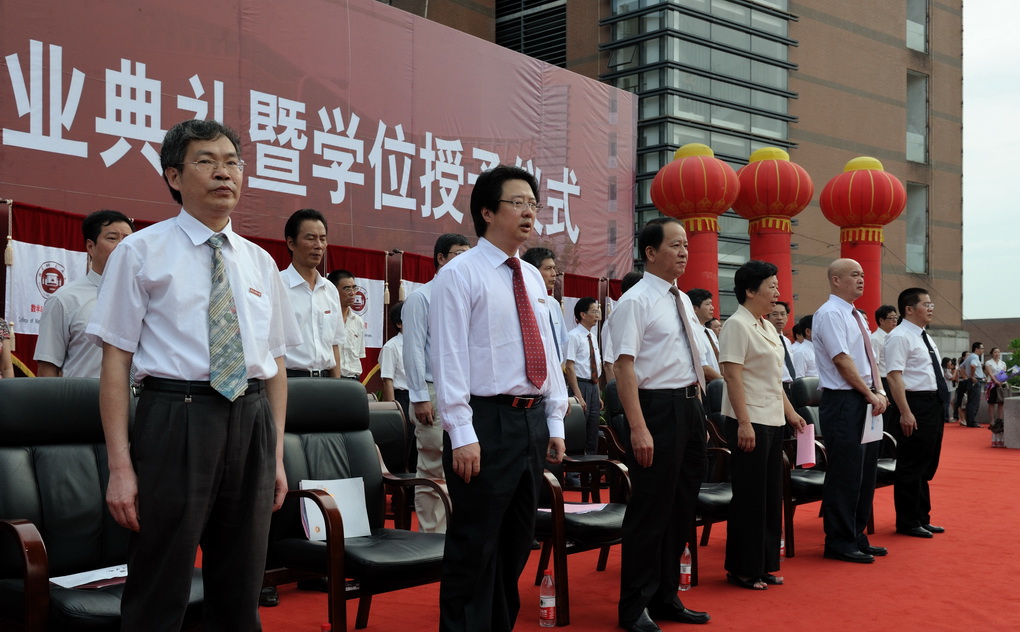 6月25日上午,2011届本科学生毕业典礼暨学位授予仪式在旗山校区图书馆前广场隆重举行。7点整,六门礼炮在广场上空鸣响,礼花绽放,掌声雷动,典礼在雄壮的《中华人民共和国国歌》声中拉开帷幕。