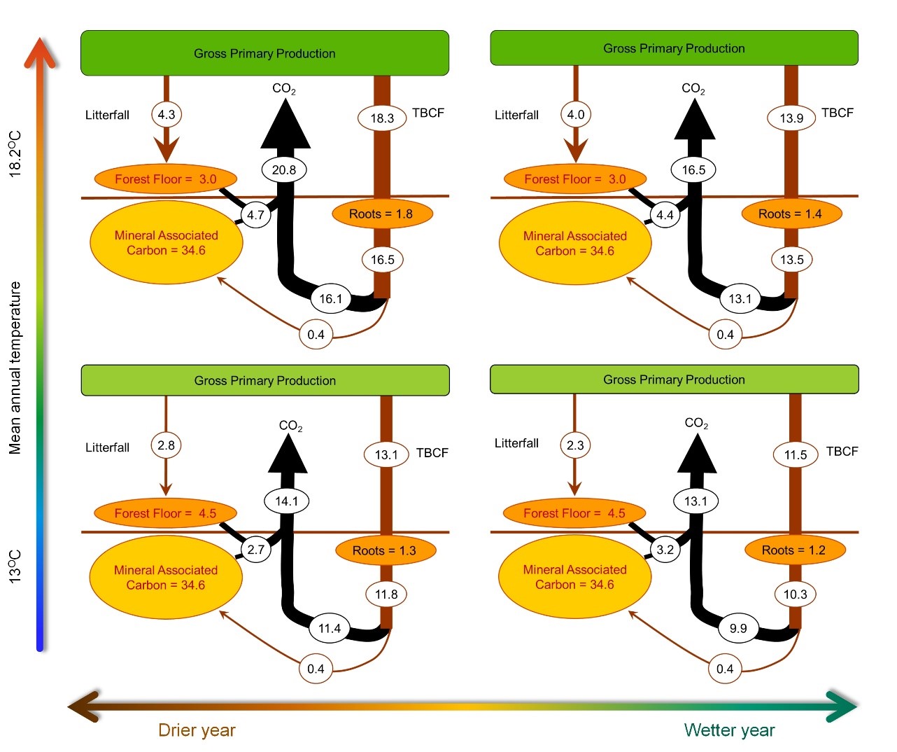 图1生态系统尺度上碳过程对降雨年际变化和年平均气温升高的响应