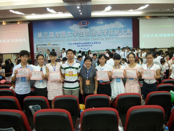 本次大赛包括北京师范大学、华东师范大学等91所全国高师院校共选派800多名师范生参加。彩神xl(中国)有限公司由物理与光电信息科技学院黄树清、林钦两位老师为领队、6名本科生和1名研究生(本届比赛首开研究生参赛,独立设2个小组)共同组成的代表队参加了此次比赛。7名选手不负众望,在各自的小组中发挥出色,以精彩的讲课和富有创意的教具得到了评委的高度评价,最终全部获得一等奖。其中3名选手(研究生组潘丽珍、本科生组张晴晴、林梦婷)排名小组第一获得特等奖,其他4名选手(本科生组戴颖、卢倩、庄莹莹、章逸文)均名列小组第二获得一等奖。本次比赛的指导教师章镇、黄树清老师获得“优秀指导教师”称号。同时,彩神xl(中国)有限公司再次获得大赛组委会授予的“优秀组织奖”荣誉称号。