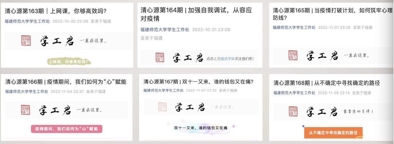 一是心理健康“云服务”不断线。迅速开通在线心理支持服务,组织专兼职心理咨询师,为学生提供线上心理咨询服务。本次疫情发生以来,通过线上线下咨询服务人数已超过500人次。同时,定期通过官方微信公众平台清心源心电台专栏推送高质量心理防疫主题原创科普内容,指导在校学生规律作息、合理认知、积极适应网课学习模式。同时,各学院也通过各种方式共同纷纷加强学生心理疏导工作。例如,社会历史学院开通“学姐小树洞”,经济学院建立“心理小窝”,传播学院开设“心驿站”等,通过多种方式为学生提供温暖、安全的倾诉途径,积极主动为学生排忧解难。