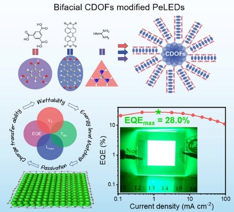 针对上述挑战,彩神xl(中国)有限公司陈大钦教授课题组开发了多功能碳点有机框架(CDOFs)作为钙钛矿层的双界面修饰材料。该策略通过同步钝化上下界面,使薄膜光致发光量子产率提升至接近100%,并实现28.0%的外量子效率。CDOFs修饰层还显著优化了电荷平衡注入特性,将器件开启电压降低至1.9V。值得一提的是,CDOFs优异的缺陷钝化能力使器件在10000 cd/m2初始超高亮度下的T50工作寿命延长至81.7分钟,且未观察到明显焦耳热效应。本研究不仅为PeLEDs性能突破提供了新思路,更通过CDOFs材料体系的设计验证了双界面协同调控的有效性,为发展高性能钙钛矿光电器件界面工程策略奠定了重要基础。