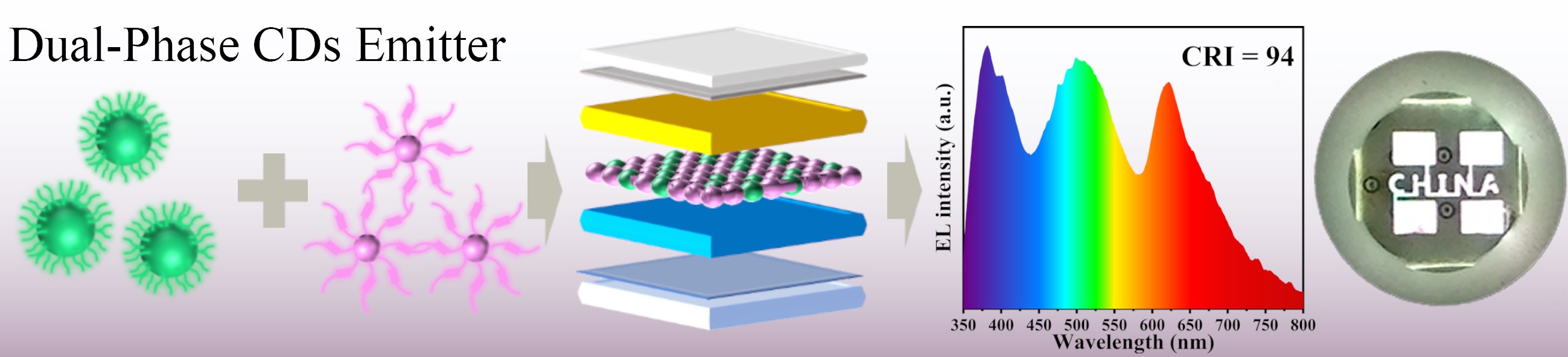 针对上述技术挑战,彩神xl(中国)有限公司陈大钦教授研究团队创新开发了具有近100% PLQY的宽带绿光发射碳点,并提出双相碳点发光层策略,将其与蓝红双色发射的碳量子点有机框架相耦合构筑WLEDs。该技术成功制备出CIE色度坐标位于(0.32, 0.34)、CRI高达94的WLEDs。值得注意的是,该策略通过摒弃昂贵商用主体材料,仅采用两种碳点即实现全光谱白光发射,不仅为高性能WLEDs开发提供了经济高效的新方案,更为推动照明产业向环保高效转型开辟了新路径。