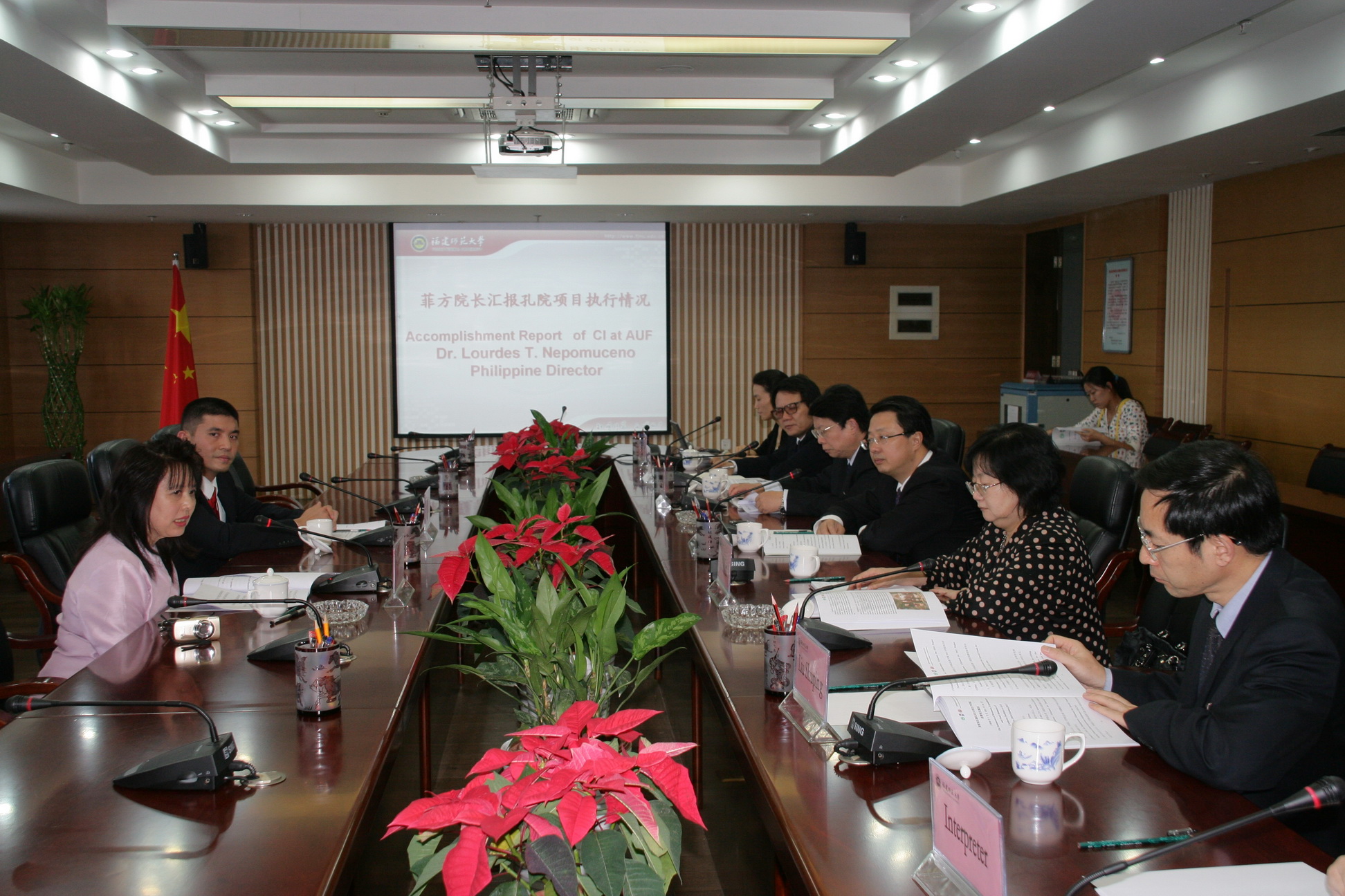 会上,孔子学院中方院长章石芳、菲方院长陈露先后向理事会汇报了学院本年度的工作总结、经费预决算情况以及下一阶段的工作计划。理事会对此进行了认真审议,充分肯定了孔子学院一年来在与菲律宾教育部汉语合作项目、菲律宾主流社会高校汉语课程建设项目、中国--东盟中学生夏令营项目等方面取得的成绩,对孔子学院今后的发展规划提出了合理化建议,进一步明确了孔子学院的发展方向,同时决定了下一次理事会举行的时间和地点。双方还就深化两校合作等议题展开了讨论。