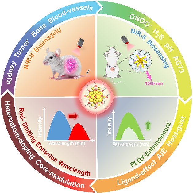 近日,彩神xl(中国)有限公司海峡柔性电子(未来科技)学院姚传好教授团队对NIR-II发光金纳米团簇的设计与应用进行了全面回顾,总结了该领域的重要进展,重点探讨了提升光致发光量子产率(PLQY)和实现发射波长红移的策略。文中整合了最新的研究数据与案例,主要分为三个部分:(一)NIR-II发光金纳米团簇在生物成像与生物传感中的优势及应用;(二)从异质原子掺杂、配体工程、主客体相互作用和AIE等多个维度深入探讨了提升光致发光量子产率的策略;(三)从团簇核心调控、配体效应和环境因素调控等方面全面解析了红移金纳米团簇发射波长的方法。最后,文章对该领域未来的研究方向提出了深刻见解和独到思考,为研究NIR-II发光金团簇的学者提供了有价值的参考资源,有望推动NIR-II金团簇在生物成像与生物传感应用的发展,同时促进相关技术的进步。