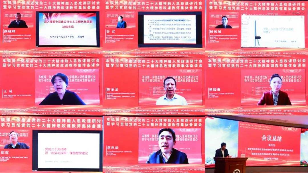 会议强调,学习宣传贯彻党的二十大精神是当前和今后一个时期全党全国的首要政治任务。全省思政课教师要认真按照党中央统一部署全面学、立足马克思主义理论学科发展深入学、作为思政课教学内容重点学、结合大学生成才成长实际针对学,切实把党的二十大精神学懂弄通、学深悟透,讲清楚、讲透彻、讲明白;要以科学的态度对待科学、以真理的精神追求真理,推动党的二十大精神一体贯通、全面融入思政课,在关键课程中讲出真理的味道,引导学生品味学理和哲理的甘甜;要加快推动党的二十大精神“三进”工作,坚持不懈用习近平新时代中国特色社会主义思想铸魂育人,充分发挥好福建独特资源优势,落实好立德树人根本任务,做好青年学生的引路人,为培养德智体美劳全面发展的社会主义建设者和接班人作出积极贡献。