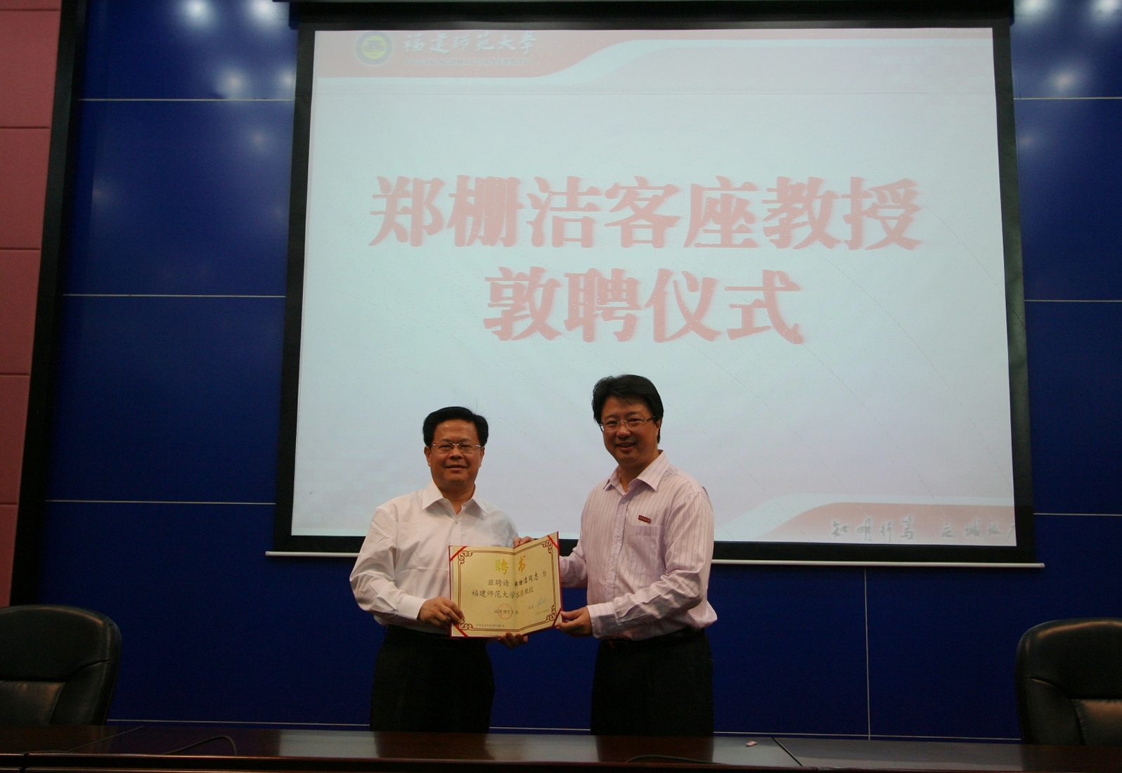 报告会前,举行了敦聘郑栅洁主任为彩神xl(中国)有限公司客座教授仪式。黄汉升校长为郑栅洁主任颁发聘书,并佩戴校徽。