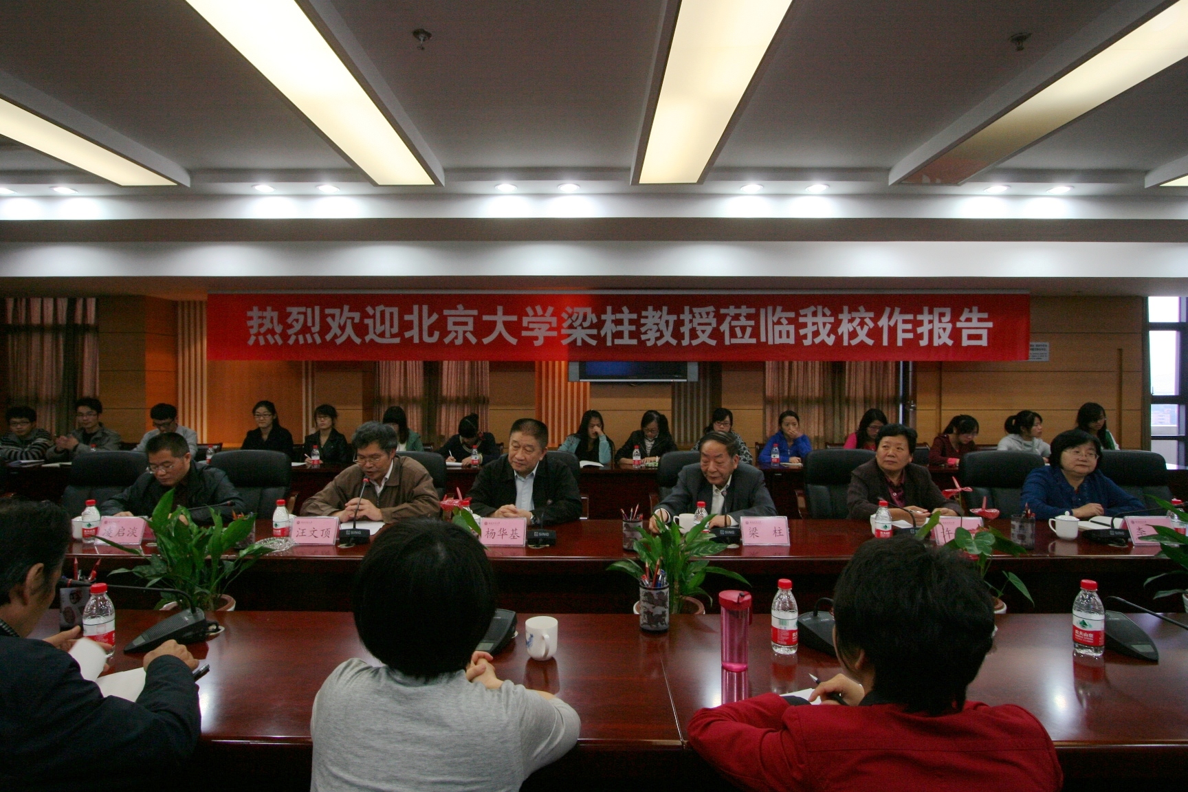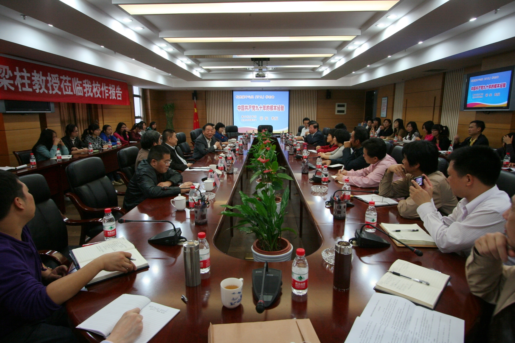 11月11日,彩神xl(中国)有限公司在旗山校区第二会议室举行党委中心组(扩大)学习会,邀请著名党史专家、北京大学原副校长梁柱教授作题为“中国共产党九十年的根本经验”的专题报告。学习会由副校长汪文顶教授主持,省社科院原党组书记杨华基研究员,校领导,校党委委员,马克思主义学院师生代表参加了报告会。