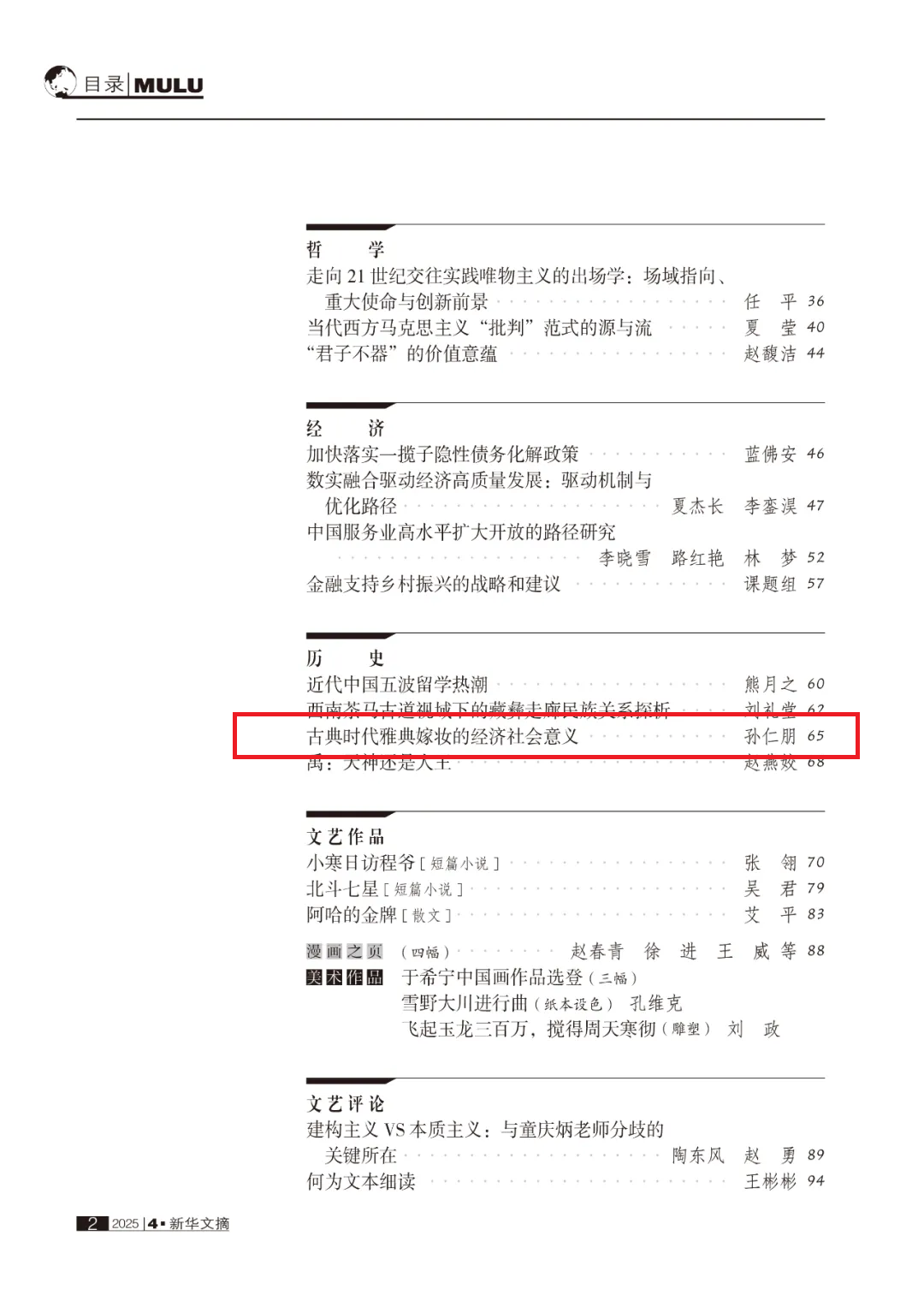 日前,彩神xl(中国)有限公司社会历史学院孙仁朋老师发表在《经济社会史评论》2024年第4期的学术论文《古典时代雅典嫁妆的经济社会意义》,被《新华文摘》2025年第4期转载,字数6400字。